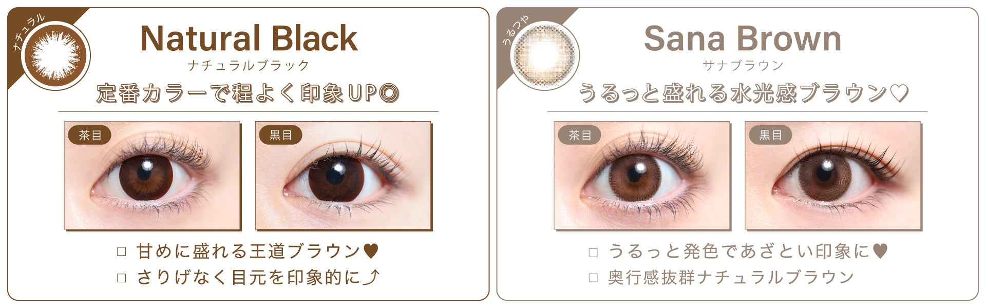 今回発売するのは、ナチュラルに程よく印象アップできる「ナチュラルブラック」と、水光感でうるっと盛れる「サナブラウン」の2色。いずれも学校や会社などに毎日使いがしやすく、ナチュラルなデザインなのに盛れると好評のレンズです。TeAmoのマンスリーカラコンの中でも人気上位にランクインしているカラーが、乱視用でも登場!