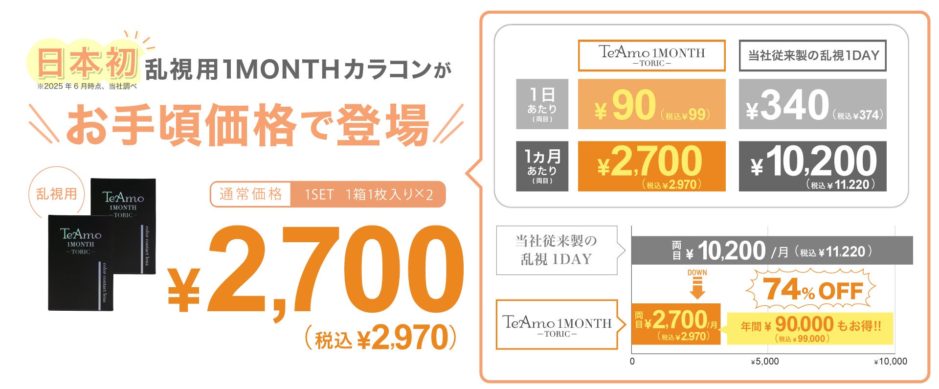 TeAmo 1MONTH TORICは1セット(1箱1枚入×2)で2,700円(税込2,970円)。