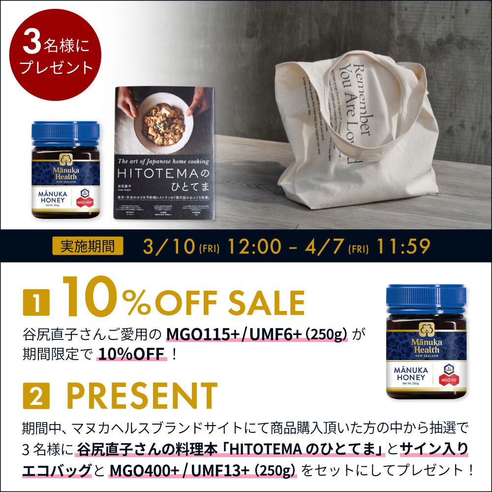 さらに、対象期間中にマヌカヘルスブランドサイトで購⼊頂いた⽅の中から抽選で3名様に、谷尻直子さんの料理本「HITOTEMAのひとてま」と「谷尻直子さんサイン入りHITOTEMAオリジナルエコバッグ」、ベストセラーはちみつの「マヌカハニーMGO400+/UMF13+(250g)」をセットにしてプレゼントいたします。