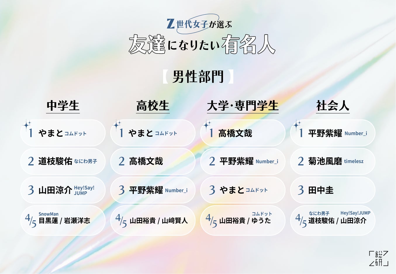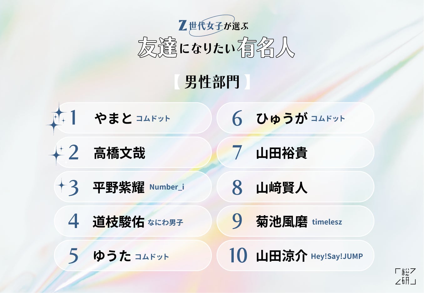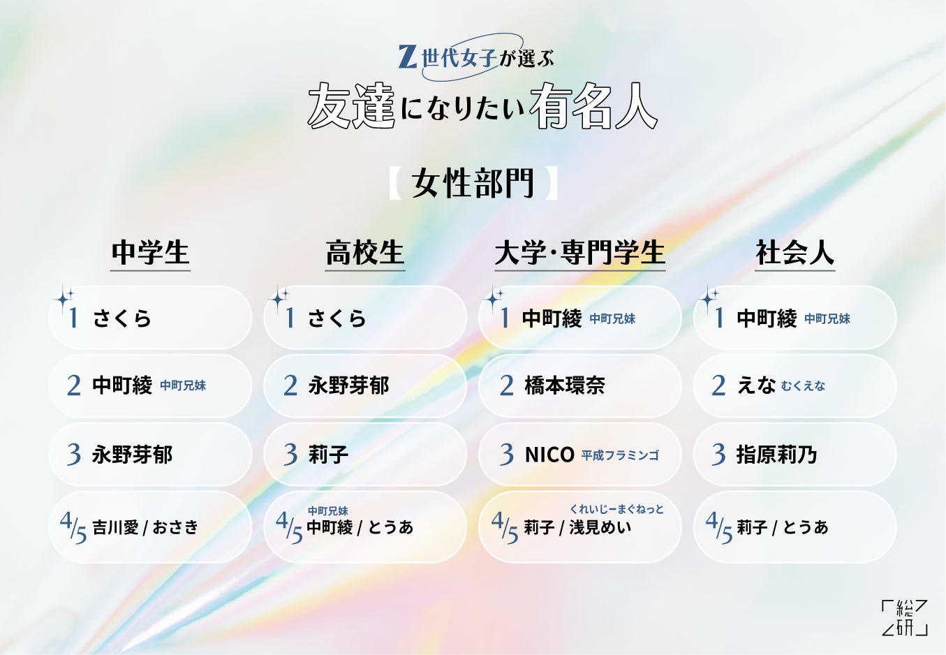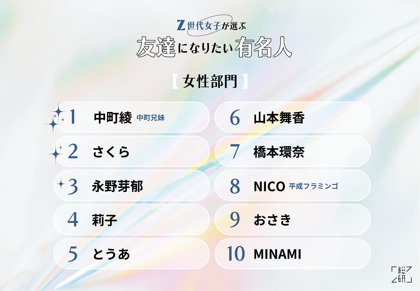 Z世代女子が選ぶ『友達になりたい有名人』ランキングTOP10。総合ランキングでは男性が「コムドット やまと」さん、女性は「中町綾」さんが1位!【Z総研】