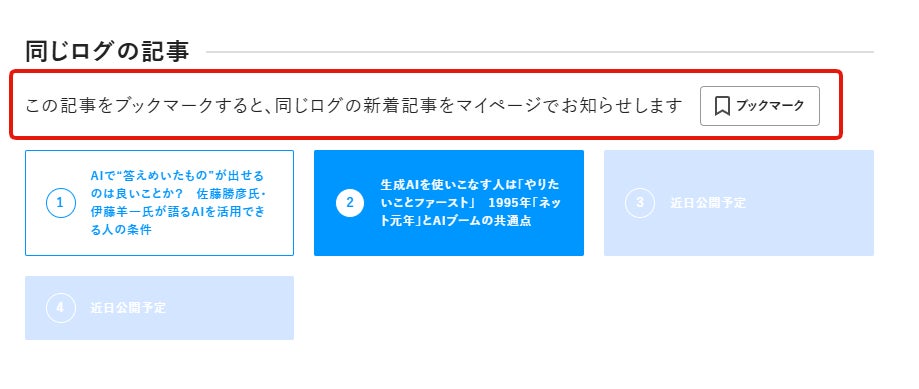 記事ページ内の「同じログの記事」エリアに、ブックマーク機能を追加しました。記事上部にあるブックマークボタンと合わせて、読者はログ単位で更新をフォローでき、新着記事の通知をマイページで受け取ることが可能です。これにより、読者はログに紐づく記事をより追いやすくなり、読み忘れ防止や継続読了につながります。