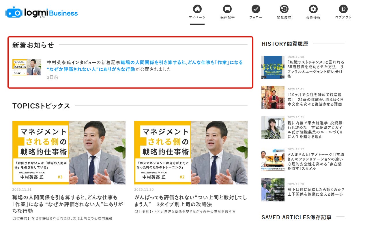 通知アイコンに表示された更新情報は、マイページ内の「新着お知らせ」欄にも一覧で表示されます。記事タイトルや公開日などが確認でき、すぐに最新記事にアクセスできます。