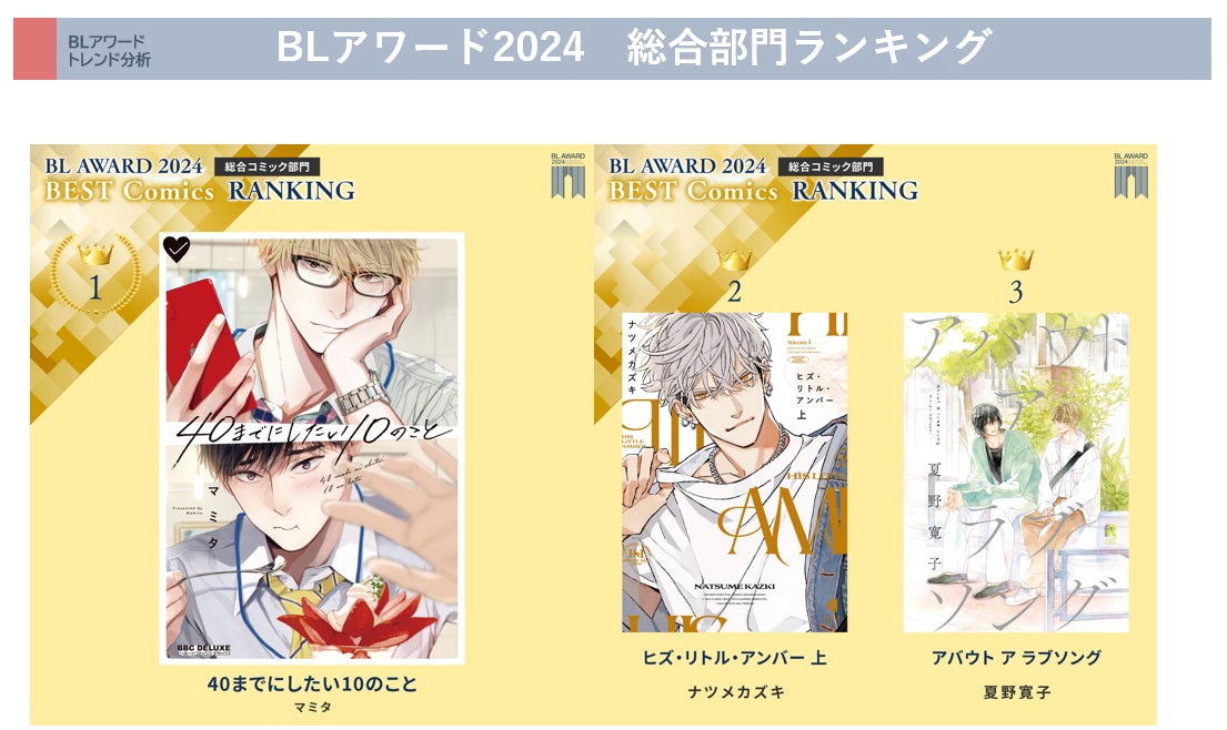 また近年は、「窮鼠はチーズの夢を見る」(2020)「Life線上の僕ら」 (2020) 「オールドファッションカップケーキ」(2022)「体感予報」(2023)などBLアワードコミック部門1位の作品が軒並み実写ドラマ化を果たすなど、メディアミックスの指標の一つとしてもご活用いただいております。