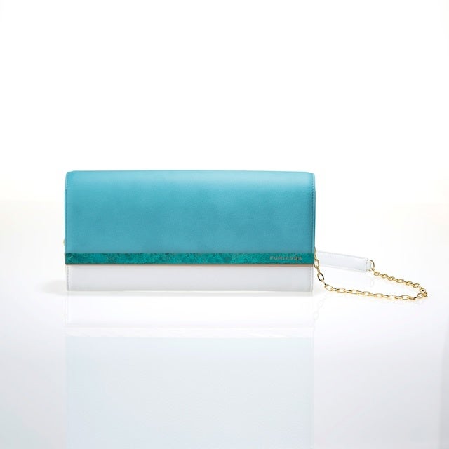 バッグブランドFUMIKODAの人気クラッチバッグ「TALA」の特別バージョンです。通常販売していないブルーのフラップカバーに富山県高岡の伝統工芸「高岡銅器」のアクセサリーパーツを採用しました。