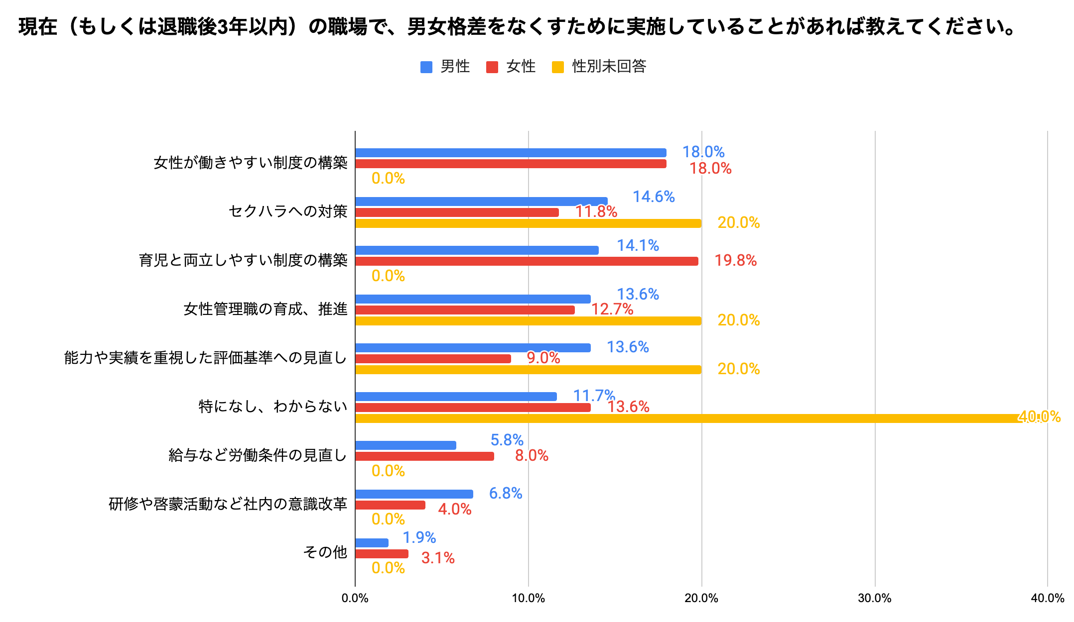 職場で男女格差をなくすために実施している施策として多い回答は「女性が働きやすい制度の構築(男女共に18.0%)、性別未回答(0%)」「育児と両立しやすい制度の構築(男性 14.1%、女性 19.8%、性別未回答 0.0%)」など。