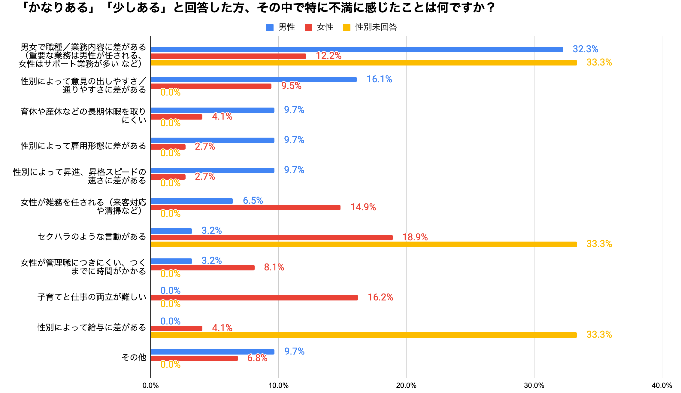 特に不満を感じた場面について、男性は「男女で職種/業務内容に差がある(32.3%)」が2位の2倍の差をつけ最多に。一方女性は「セクハラのような言動(18.9%)」「子育てと仕事の両立が難しい(16.2%)」と続く結果に。