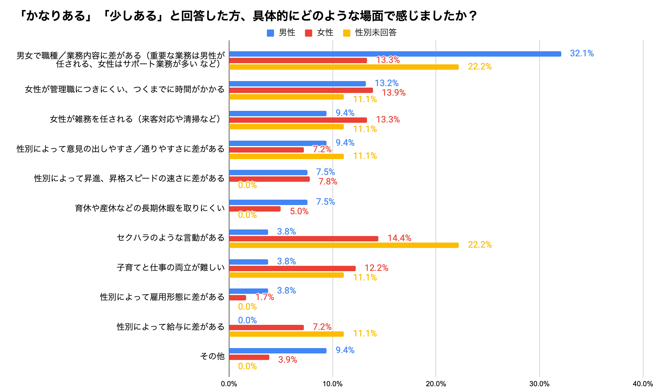 男女で職種/業務内容に差がある(重要な業務は男性が任される、女性はサポート業務が多い など)(男性 32.1%、女性 13.3%、性別未回答 22.2%)