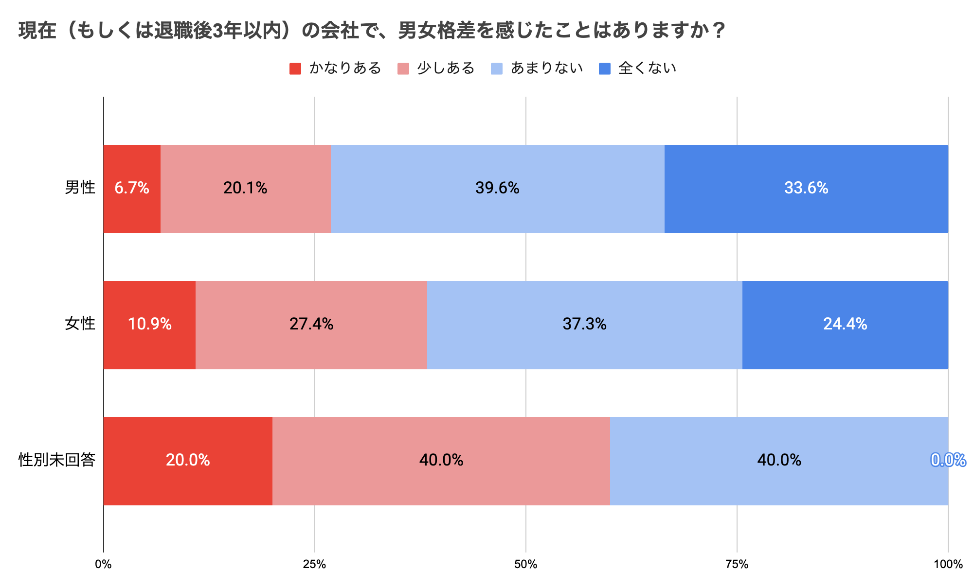 現在(または以前)の会社で「男女格差を感じたことがある」と回答した男性は24%、一方で女性は約35%と、10%の開きがある結果に。
