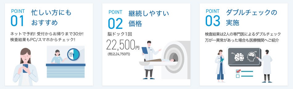スマートスキャンが提供する 「スマート脳ドック」は脳動脈瘤や脳梗塞、脳腫瘍などの自覚症状のない脳の異常を早期発見できる頭部MRIおよび頭部・頸部MRAの検査です。WEBでの予約と問診票の事前登録、受診結果をパソコンやスマートフォンで確認できるため、クリニック滞在時間を短縮し受付からお帰りまで30分。撮像されたデータは、放射線科診断専門医と脳神経外科専門医によるダブルチェックを行っています。万が一異常が確認された際も、結果に応じ専門の医療機関をご紹介。スピーディーな検査と1回22,500円と継続しやすい価格で、2018年のサービス開始からこれまでに累計12万件の検査を実施しています。