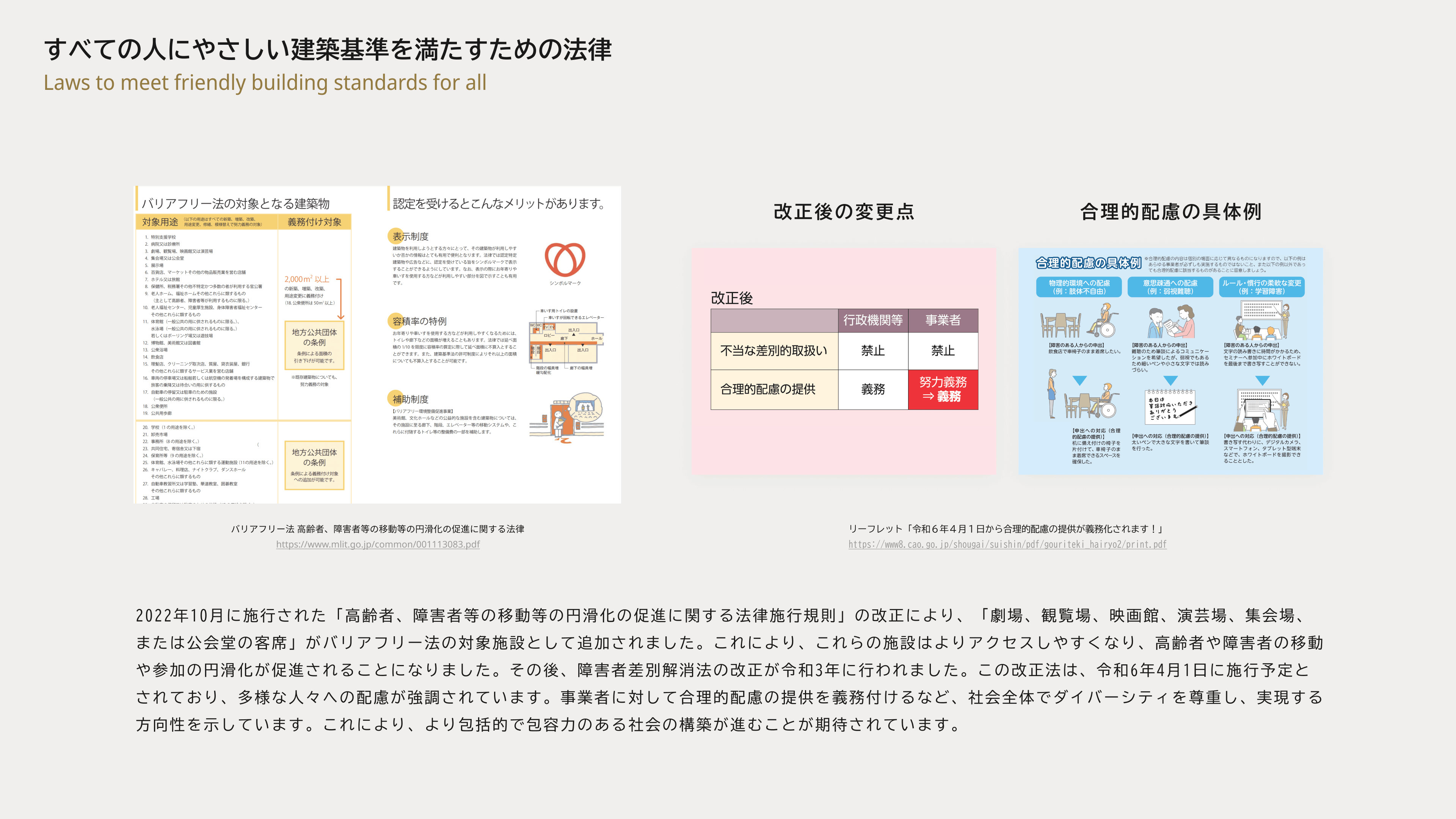 この改正により、事業者が様々なサービスの提供を行う空間そのものにおいても、より包括的な配慮を行うための設計方針が必要になることが予想されます。