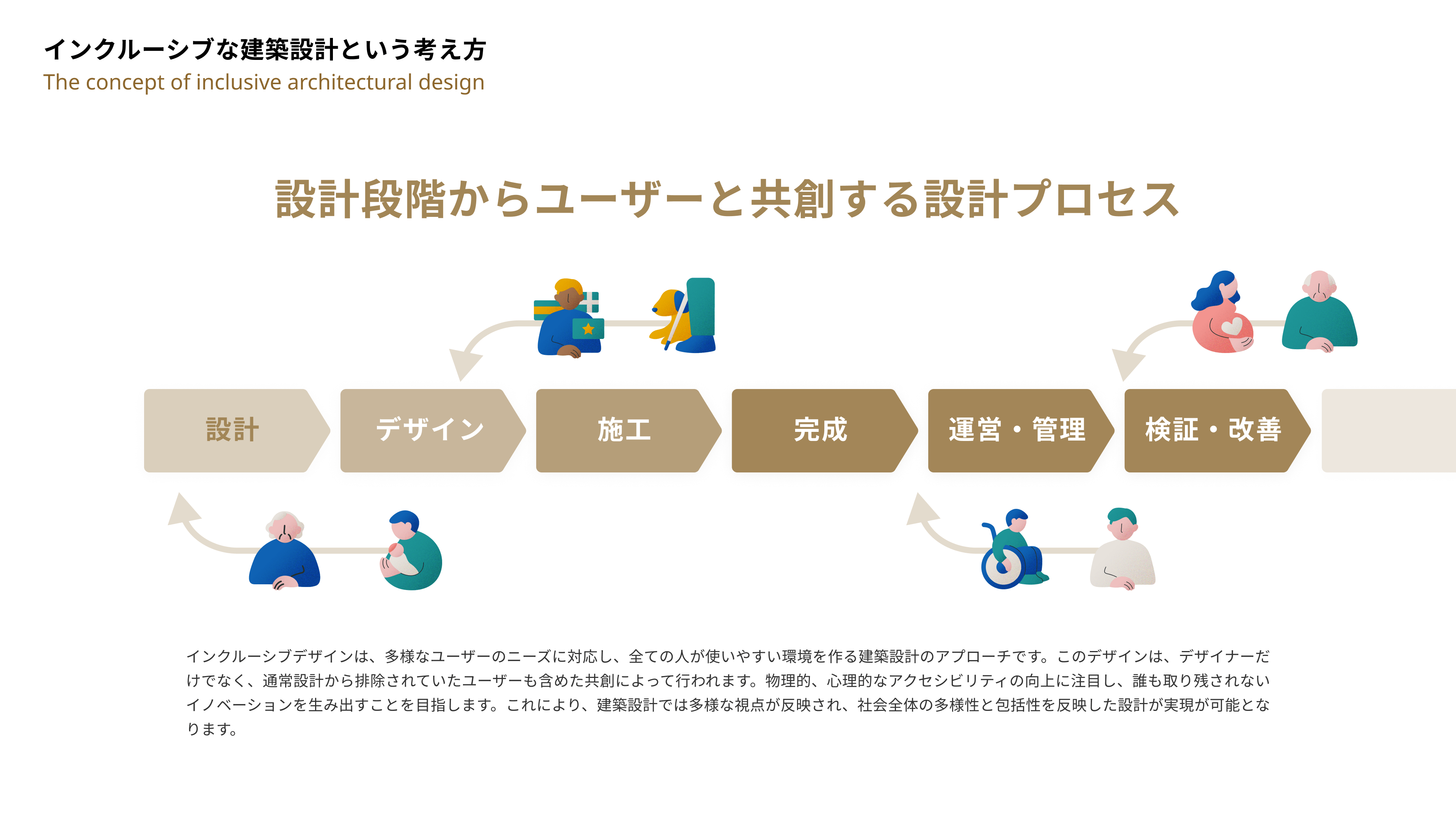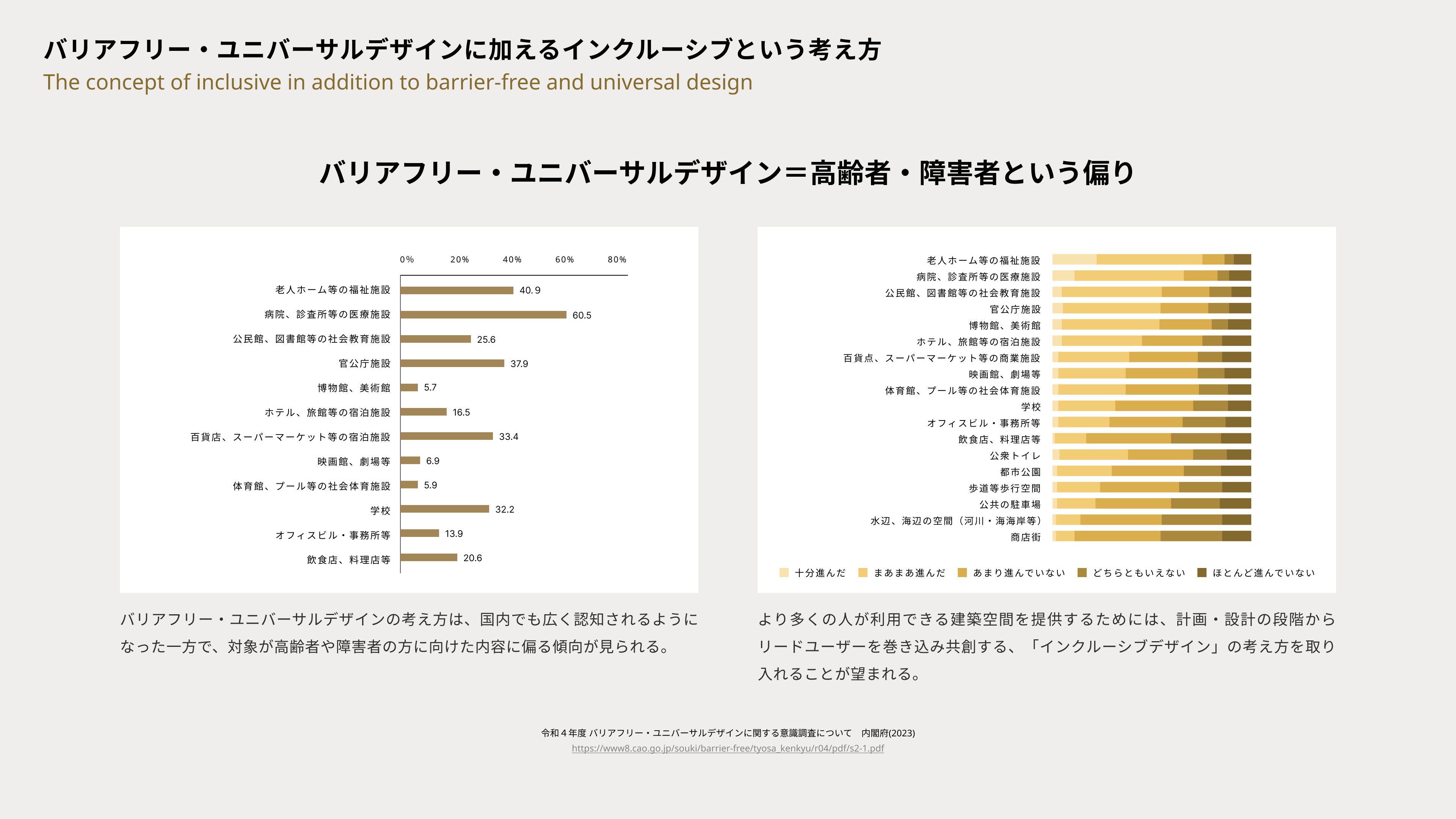 バリアフリー・ユニバーサルデザインの考え方は、国内でも広く認知されるようになった一方で、対象が高齢者や障害者の方に向けた内容に偏る傾向が見られる。より多くの人が利用できる建築空間を提供するためには、計画・設計の段階からリードユーザーを巻き込み共創する、「インクルーシブデザイン」の考え方を取り入れることが望まれる。