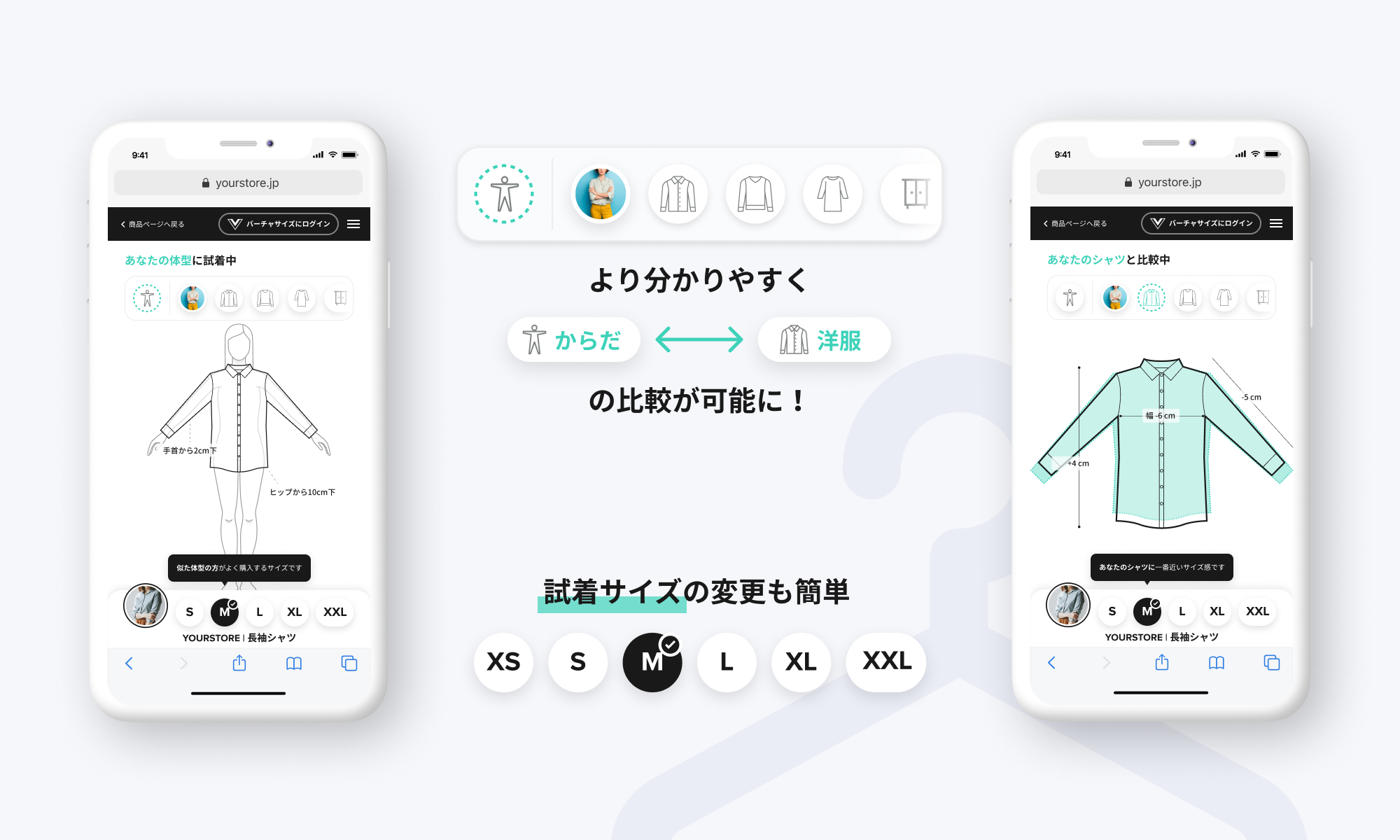 ・「からだと洋服の比較」で詳細なフィット感を直感的に確認