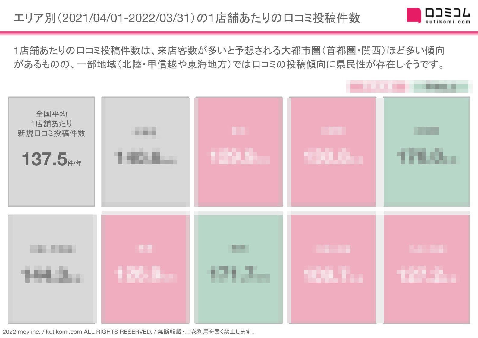詳細なレポートでは1店舗あたりの年間口コミ投稿件数のエリア別数値も掲載していますので、是非ダウンロードして詳細をご確認ください。