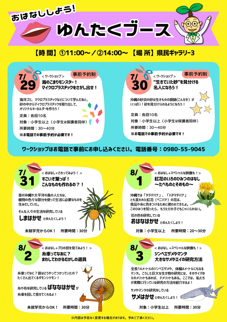ワークショップの事前予約はお電話にて受付。 『 予約専用番号:0980-55-9045 』 |