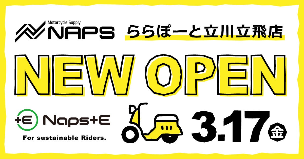 オートバイ用品の小売・開発を行う株式会社ナップス(本社:神奈川県横浜市、代表取締役:望月 真裕)は、オートバイ用品店「ナップスららぽーと立川立飛店」(所在地:東京都立川市泉町935-1 ららぽーと立川立飛2階)を2023年3月17日(金)に新規オープンすることをお知らせいたします。