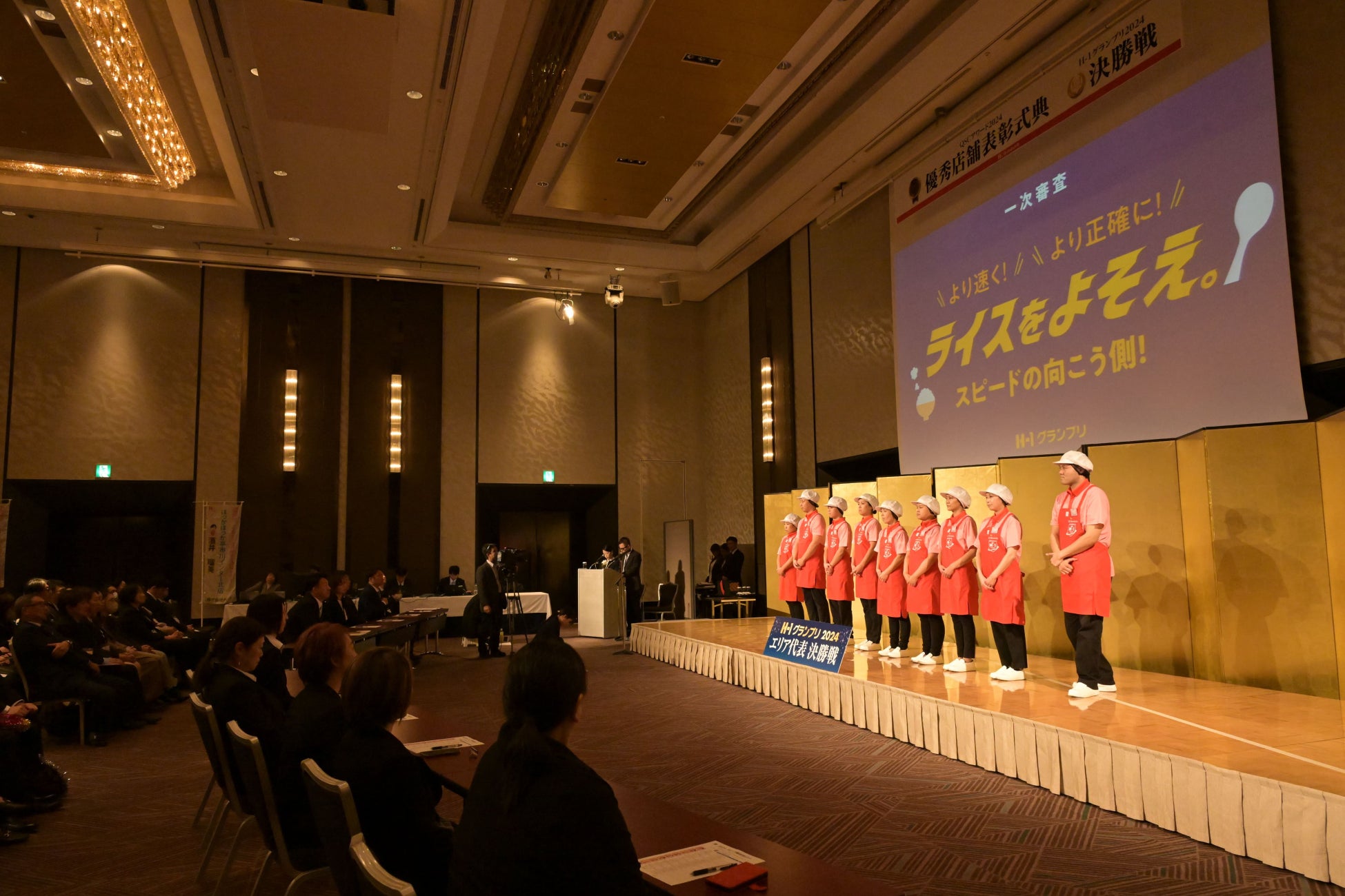 また、QSCスキルNo.1を決める個人部門「H-1グランプリ」も同時開催しています。「クオリティ評価」の一次選考では、ほっかほっか亭の大人気メニュー「とりめし」のスピード調理を競い、「サービス&クリンリネス評価」の二次選考では、第三者機関による接客スキル覆面調査が行われ、決勝戦をヒルトン大阪で行いました。