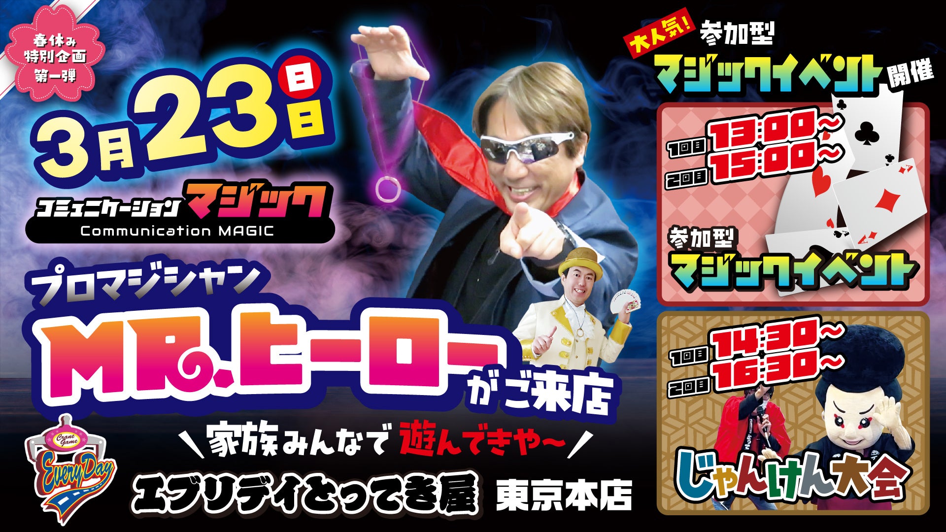 「笑顔創造」が企業理念の株式会社東洋(代表取締役:中村秀夫/本社:埼玉県北本市以下、当社)は、運営するクレーンゲームのテーマパーク【エブリデイとってき屋東京本店】にて、八潮陥没事故以来、不安な日々を過ごしている地元のみなさんに笑顔を届けたく、3月23日にスーパープロマジシャンのMr.HEROを招いて、参加型コミュニケーション・マジックを開催します。
