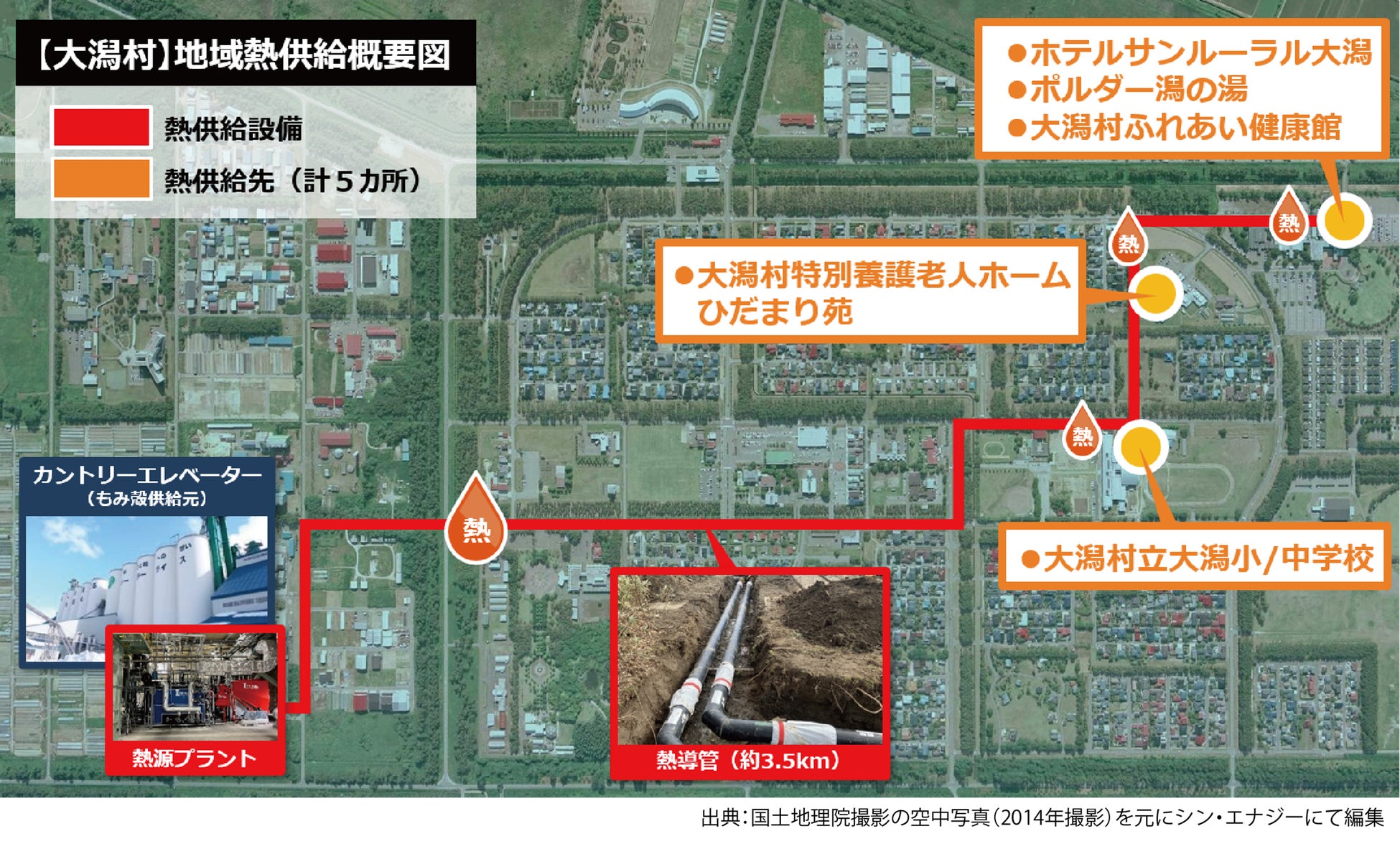 本プロジェクトは、村内で大量発生するもみ殻(稲の実の外皮)を燃料としてバイオマスボイラーで熱を生み出し、地中に埋設した熱導管を通じてホテルや温浴施設に再生可能エネルギー由来の熱供給を行うものです。