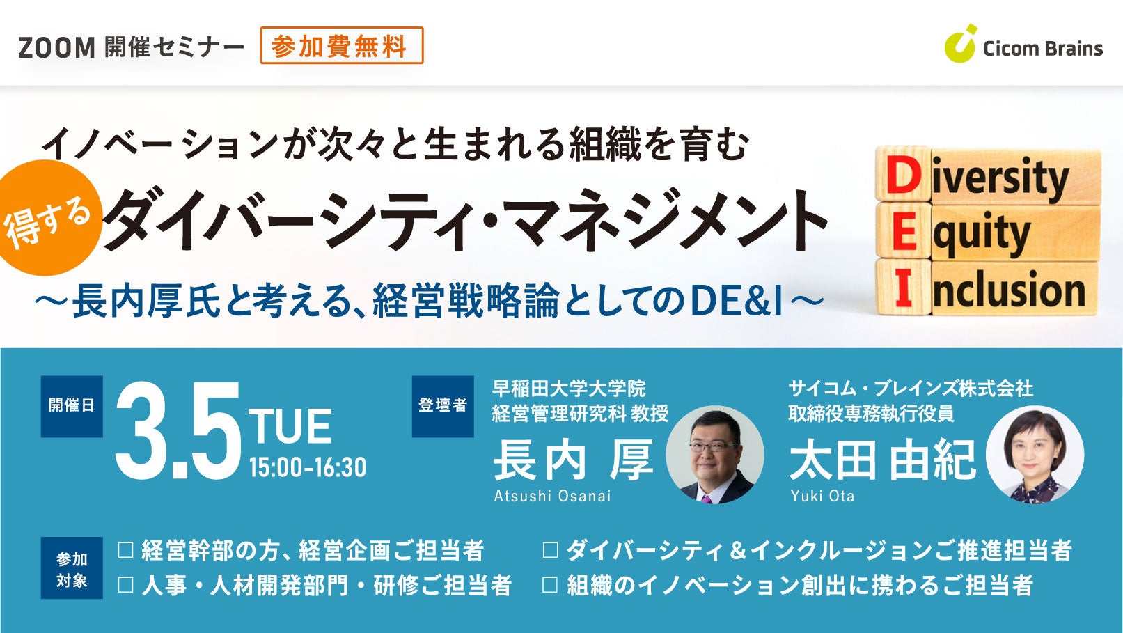 【イノベーションが次々と生まれる組織を育む “得する”ダイバーシティ・マネジメント】サイコム・ブレインズ、経営戦略論としてのDE&Iをテーマとしたオンラインセミナーを3月5日(火)に開催