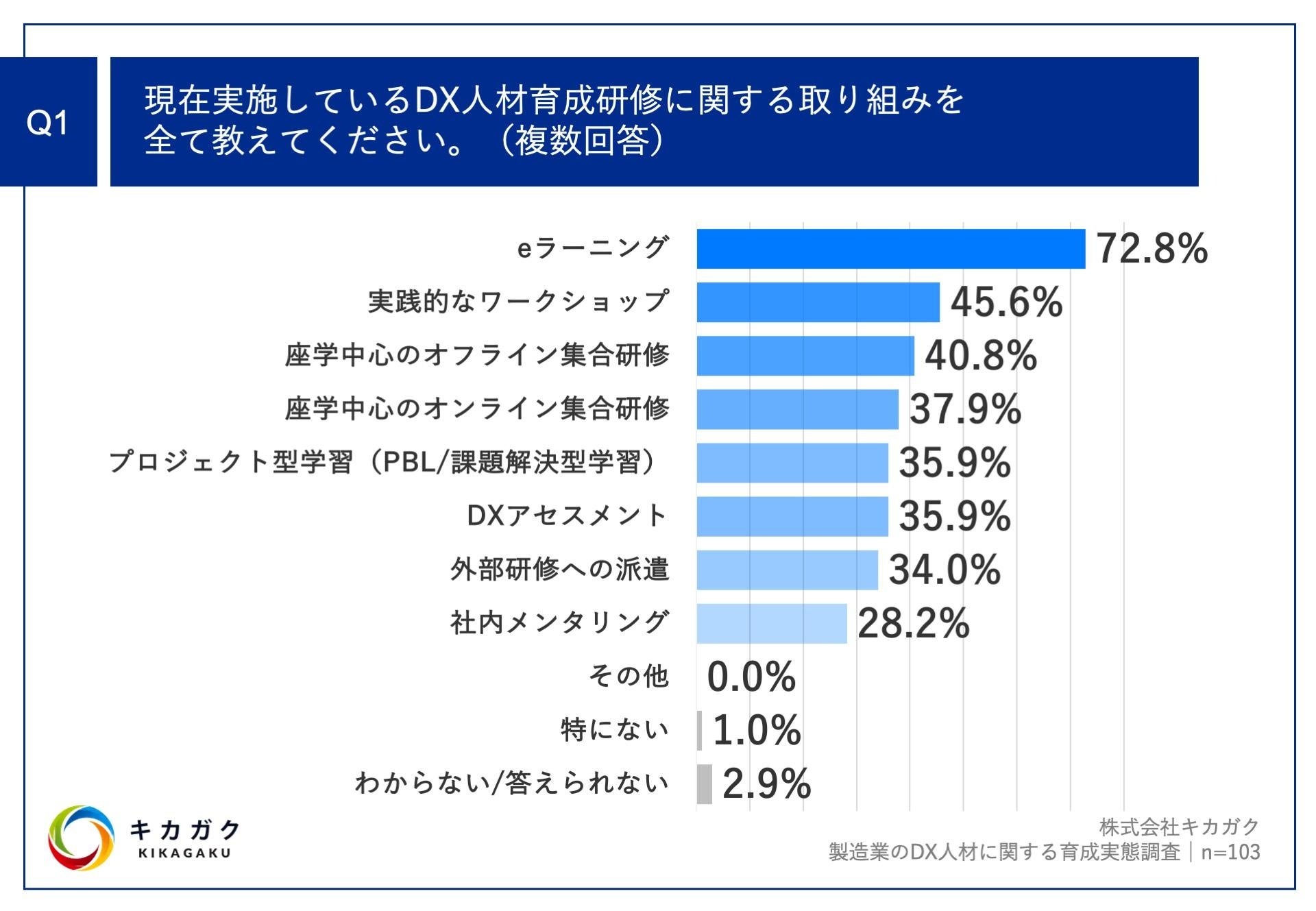 「Q1.現在実施しているDX人材育成研修に関する取り組みを全て教えてください。(複数回答)」(n=103)と質問したところ、「eラーニング」が72.8%、「実践的なワークショップ」が45.6%、「座学中心のオフライン集合研修」が40.8%という回答となりました。