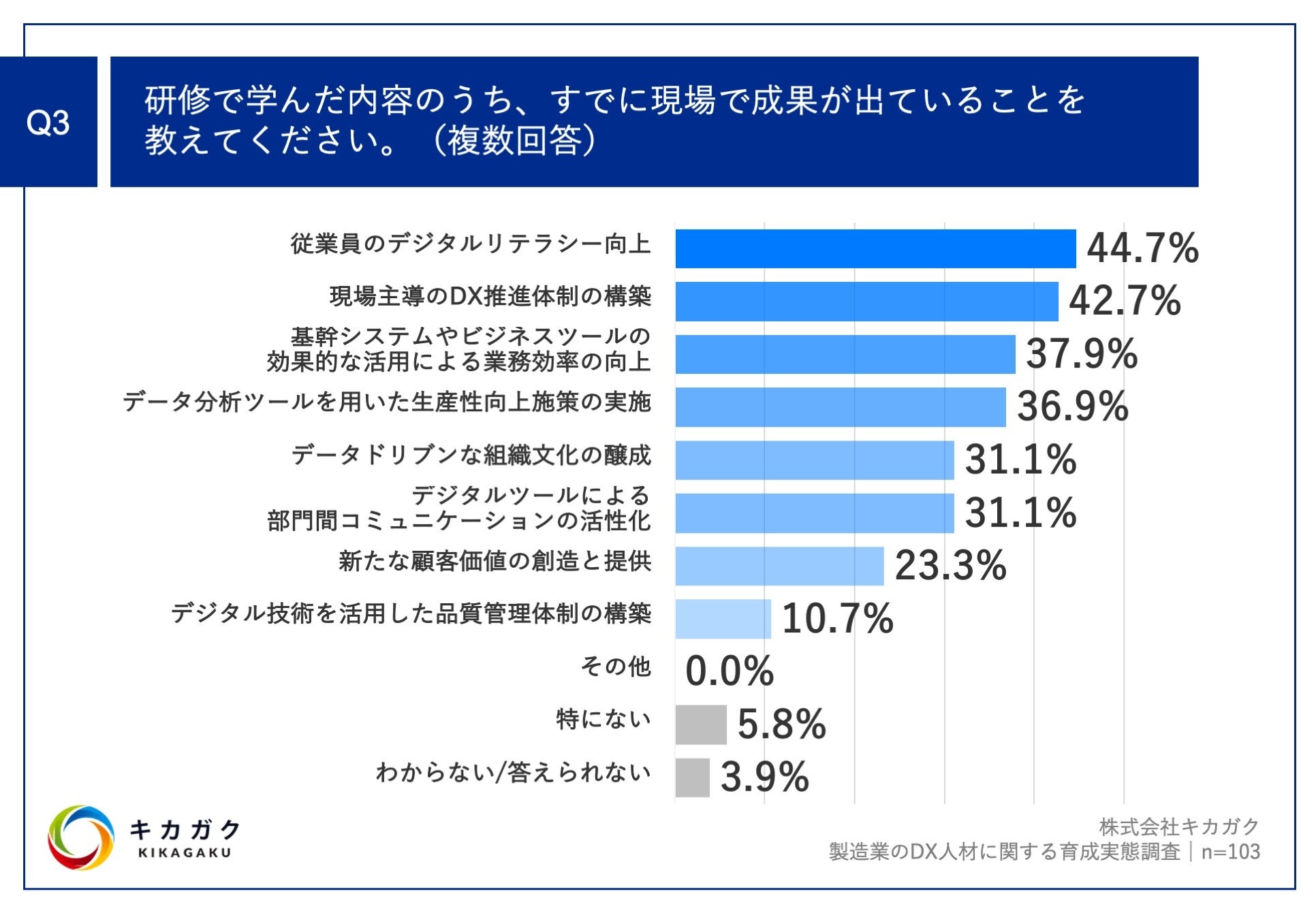 「Q3.研修で学んだ内容のうち、すでに現場で成果が出ていることを教えてください。(複数回答)」(n=103)と質問したところ、「従業員のデジタルリテラシー向上」が44.7%、「現場主導のDX推進体制の構築」が42.7%、「基幹システムやビジネスツールの効果的な活用による業務効率の向上」が37.9%という回答となりました。