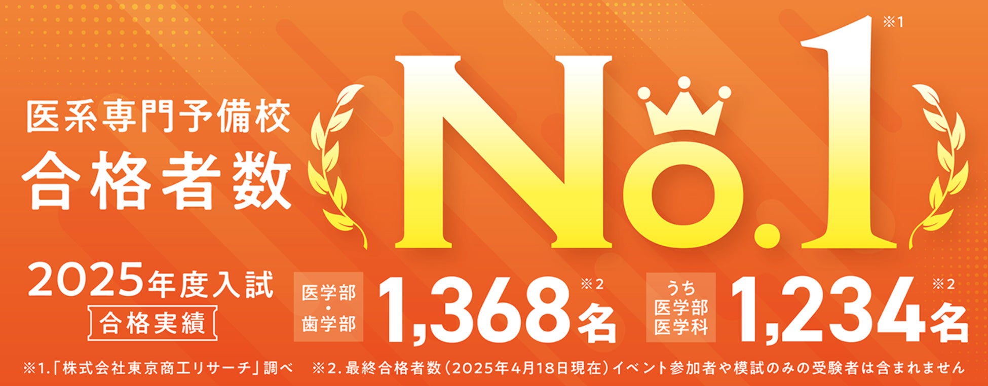 北海道〜九州まで全国26校を展開する医系専門予備校メディカルラボ(河合塾グループ)は、株式会社東京商工リサーチが2025年4月に医系専門予備校について実施した調査で、2025年度入試における合格実績部門において、医系専門予備校合格者数No.1を獲得しました。メディカルラボはこれからも、医学部を志す皆さまを個別最適のきめ細やかな指導でサポートし、生徒一人ひとりを医学部合格へ導いてまいります。