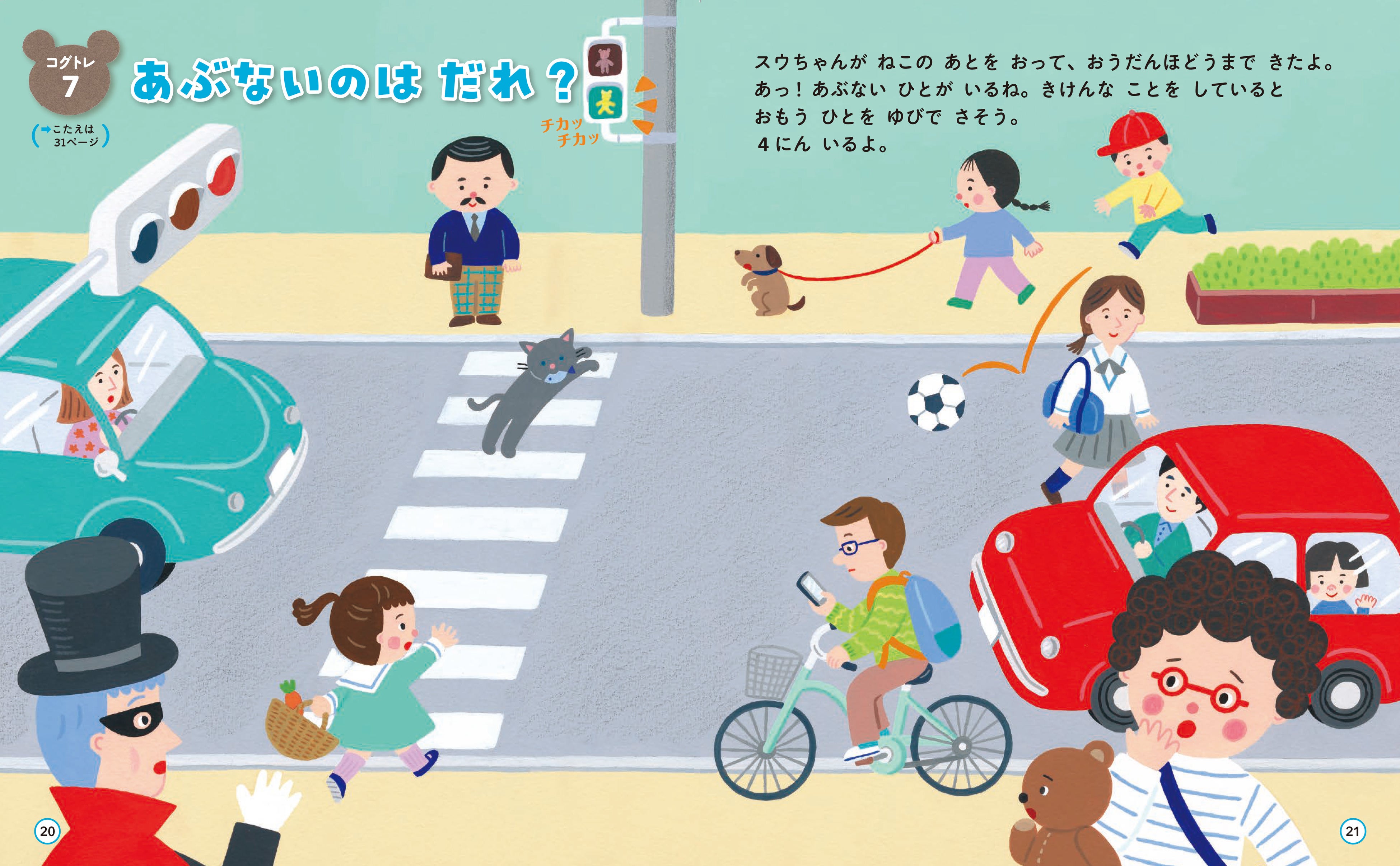 「えほんコグトレ」では、そういった日常生活にひそむ危険を想像するトレーニングも収録しています。