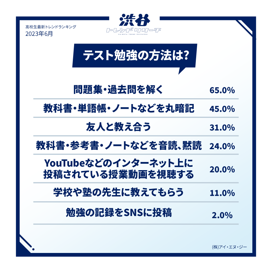 「問題集・過去問を解く」、「教科書・単語帳・ノートなどを丸暗記する」が多数を占める結果になりました。コメントでは、「過去問を解くことでテスト慣れをしている」「教科書や単語帳を丸暗記した後、問題集を解くことで知識がより定着する」が散見され、自分に合った勉強方法を身につけている高校生が多くいました。また、「YouTubeなどのインターネット上に投稿されている授業動画を視聴する」については、「分かりやすくまとめられているから、短時間で要点を押さえた勉強が出来る」のほか、「自分のスピードで勉強を進められる」などの意見が挙げられており、学校などの授業と異なり、自分が理解出来ていない部分を効率的に学べる学習方法として支持を得ています。