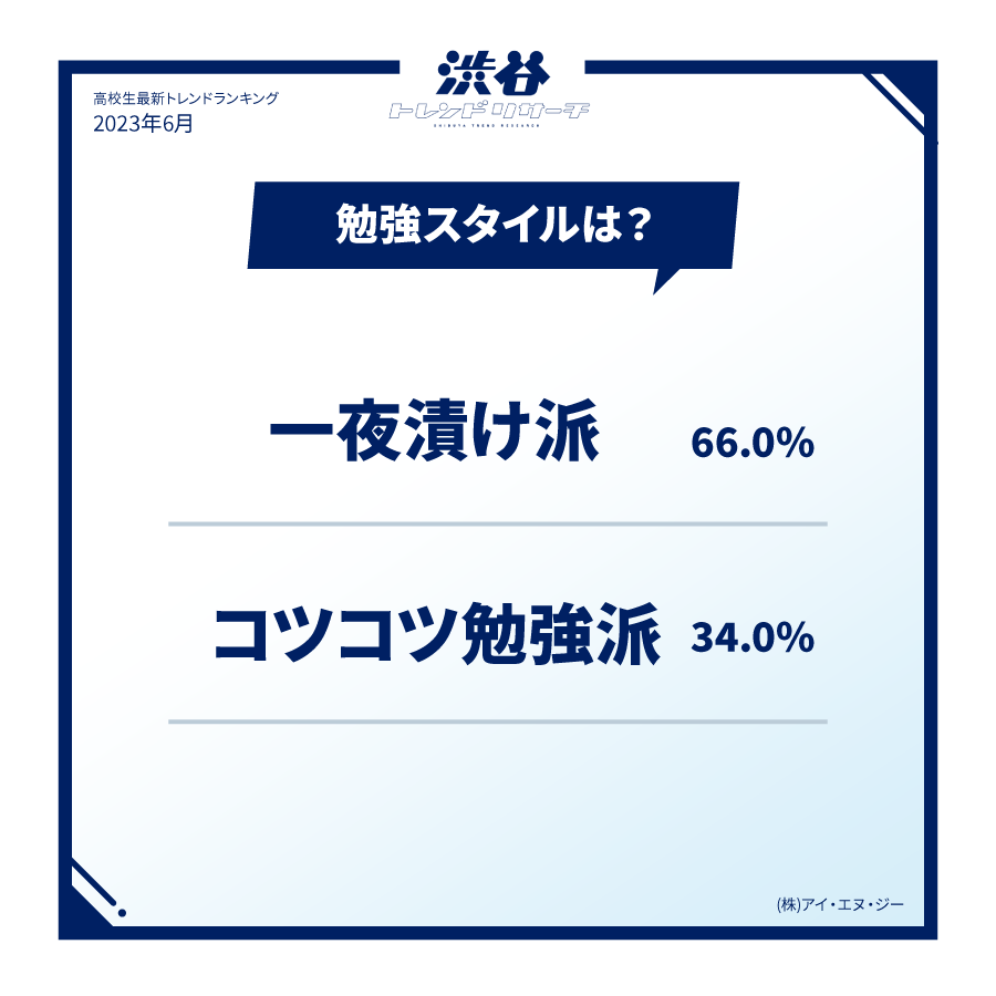 「一夜漬け派」が約7割という結果になり、過半数の高校生がコツコツ勉強するよりも一夜漬けでテストに臨んでいることが分かりました。「面倒臭いから」「直前にならないとやる気がでない」などのコメントが寄せられた一方で、「ピンチになると本気が出せる」や「短期記憶で一気に覚える」ともあり、自らを追い込むような環境を作り出すことで、勉強に集中している様子が窺えました。また、「コツコツ勉強派」では、「理解出来なかった部分を友達と相談し合うことで仲良くなった」という声も挙がっており、勉強をコミュニケーションツールとしている高校生もいるようでした。