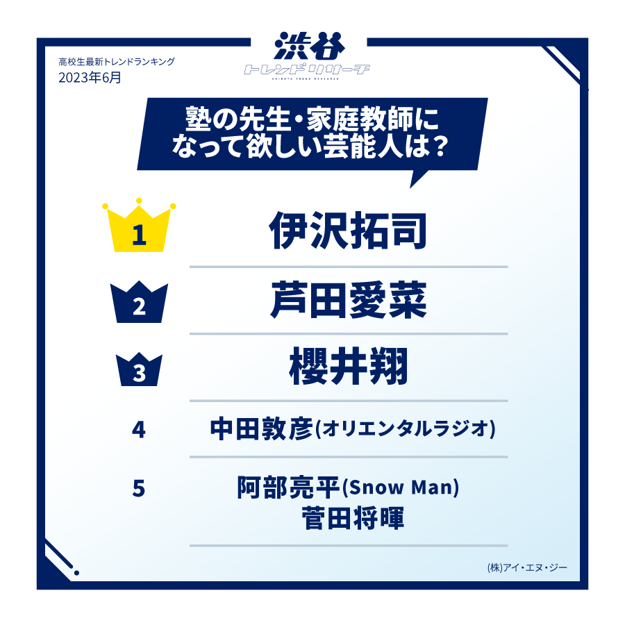 「伊沢拓司」さんが1位を獲得。「東大卒だから」「頭が良いし、優しいから」「膨大な知識量で、楽しく教えてくれそう」といったコメントが多数見られ、弊社で2023年4月に公開した調査「担任の先生になって欲しい芸能人」とは異なり、先生役を演じた経験よりも、本人の頭の良さを重視している様子が窺えました。