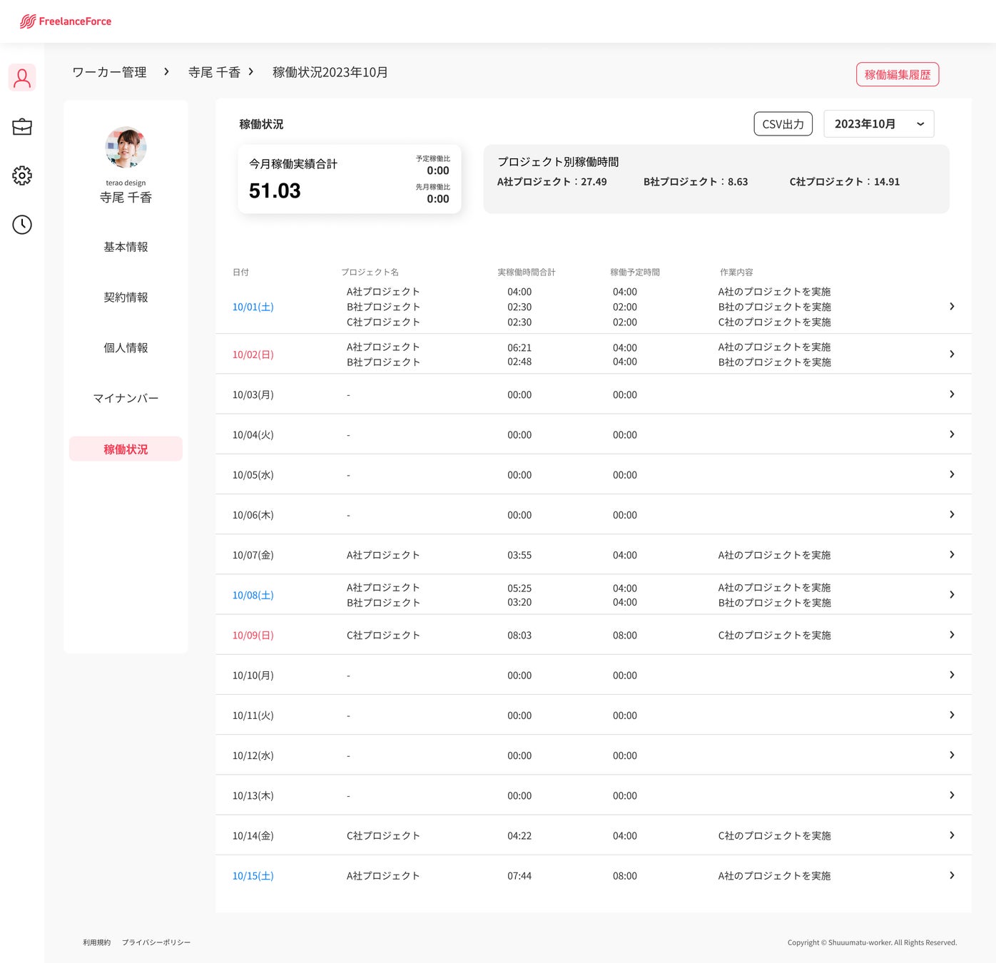 企業は業務委託人材ごとの稼働実績をリアルタイムで把握できる