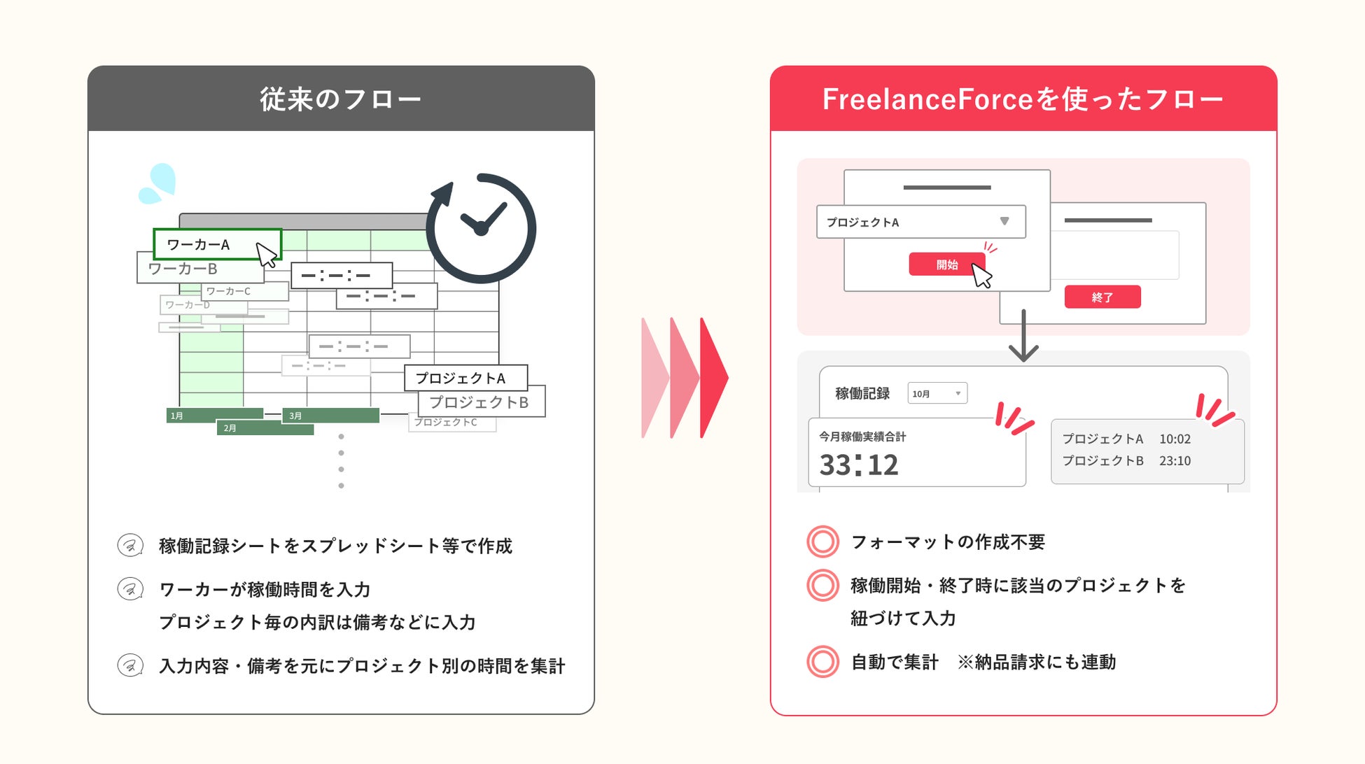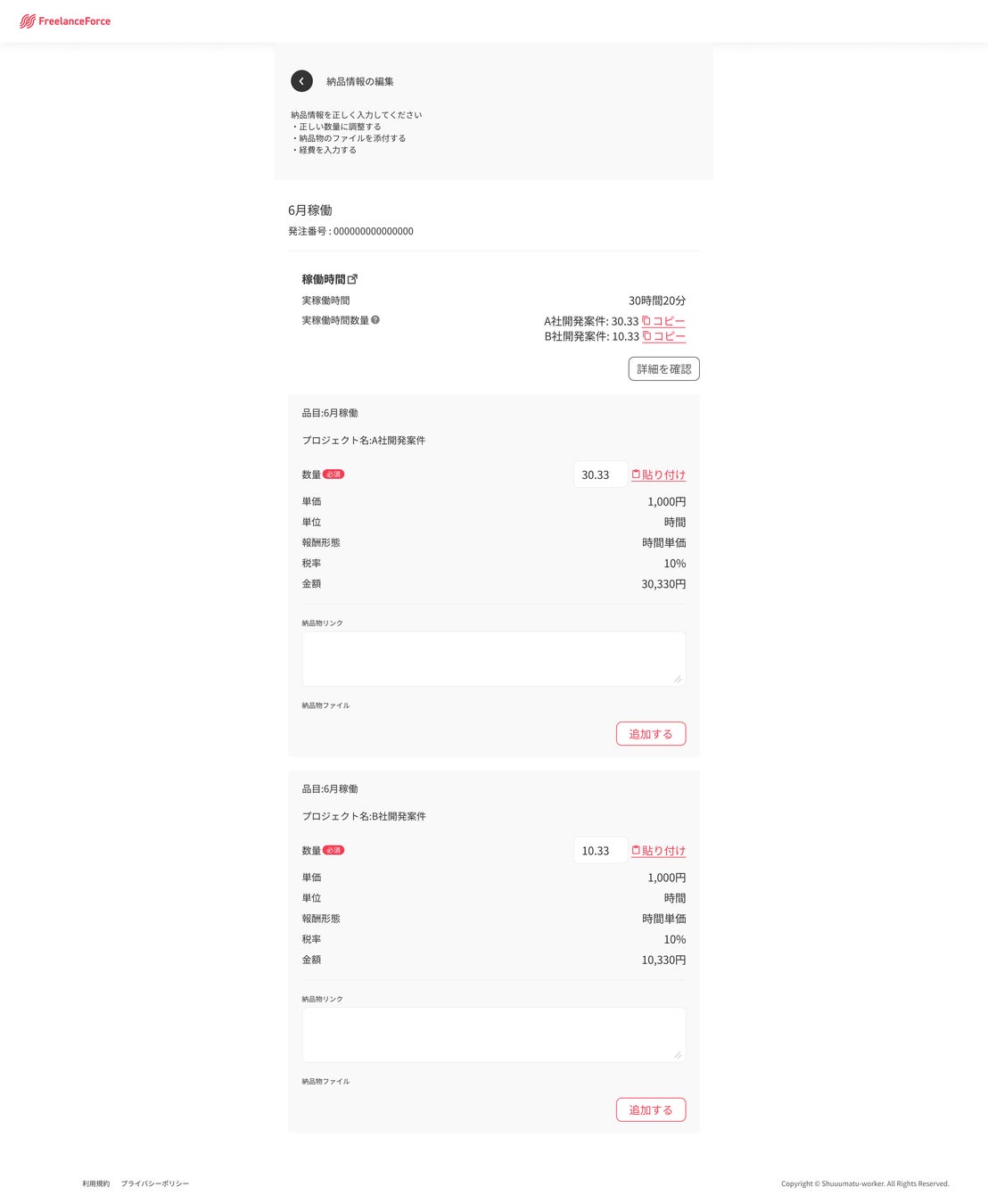 ワーカーは納品、請求書の提出時にプロジェクト毎の稼働時間をコピー&ペーストだけで簡単に報告できる