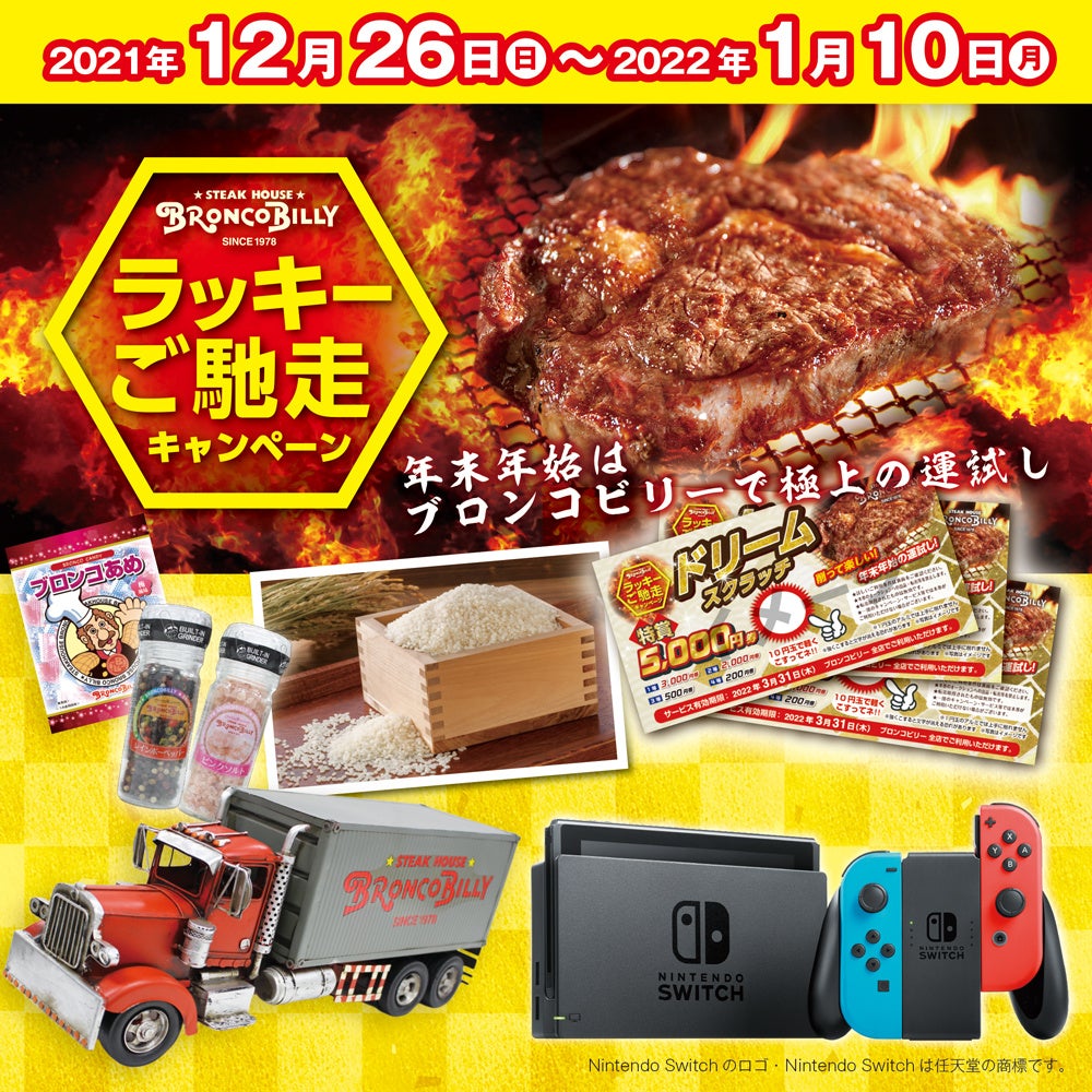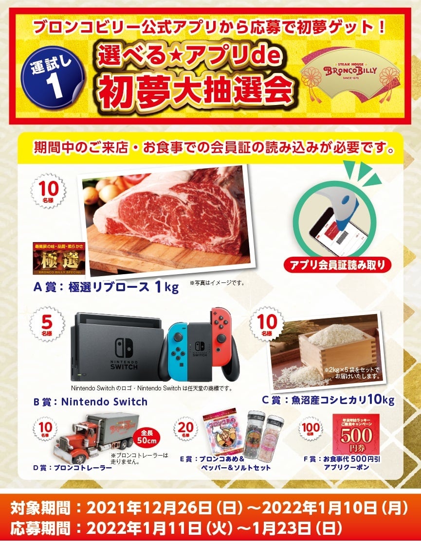 さらに、ブロンコビリー公式アプリ会員の皆さまを対象に、「選べる★アプリde初夢大抽選会」も開催いたします。ご家庭でもブロンコビリーをお楽しみいただける、極選リブロース1㎏や魚沼産コシヒカリ10㎏など、期間中のお食事で豪華賞品が当たるチャンス!ぜひ”肉の神様”を味方につけて、年始めの運試しをお楽しみください。