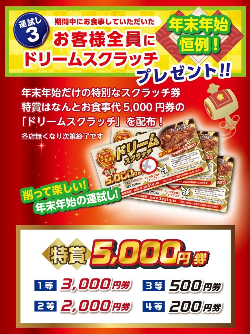 年末年始だけの、特別なスクラッチ券をプレゼントいたします。特賞は5,000円分のお食事券など、当選内容がいつもよりグレードアップ!