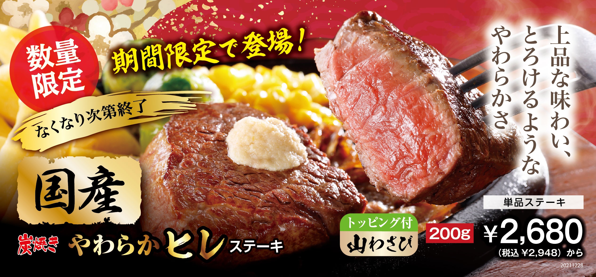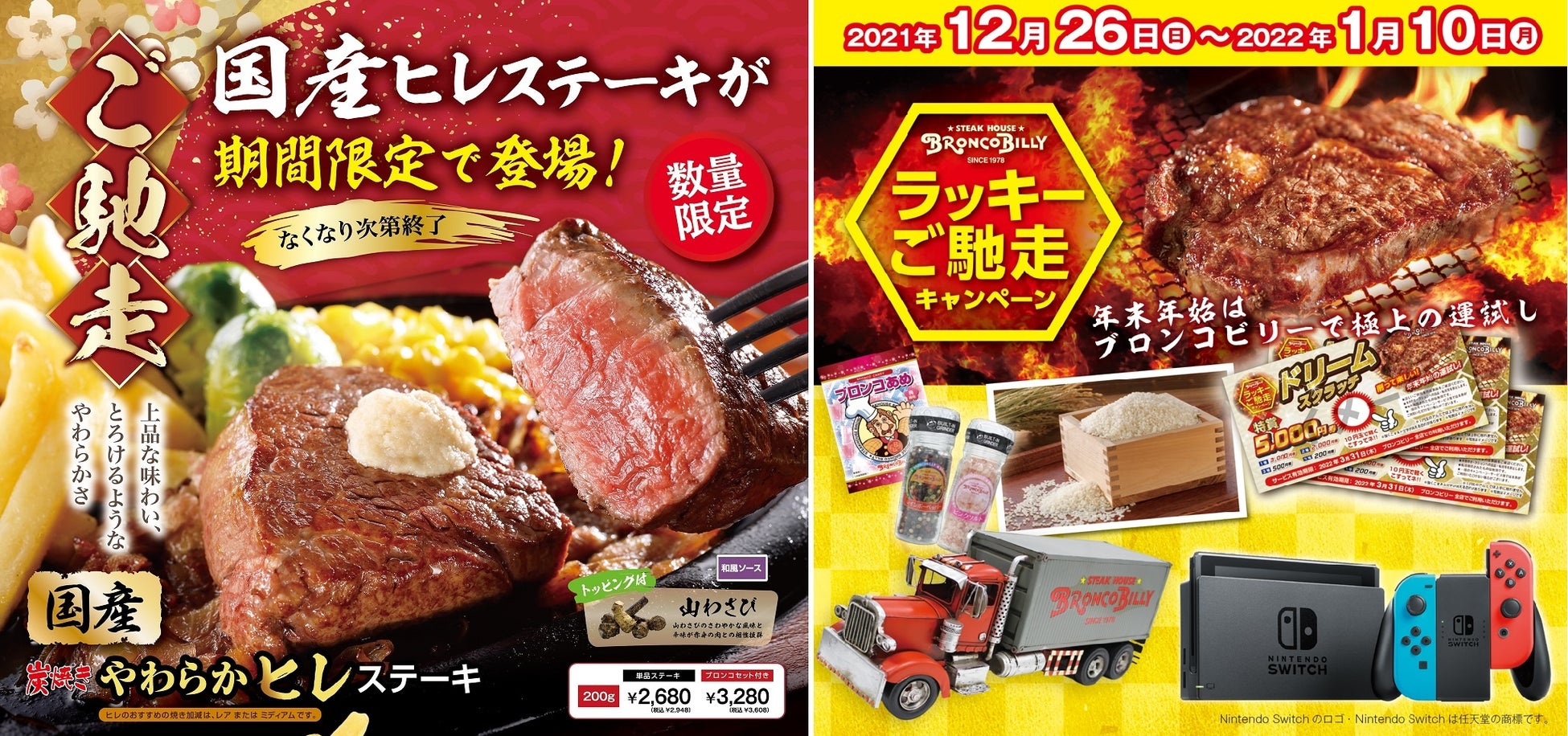 株式会社ブロンコビリー(本社:愛知県名古屋市 代表取締役社長:竹市 克弘)は12月28日(火)より、『国産 炭焼きやわらかヒレステーキ』を全129店舗で提供を開始します。同年8月の「夏のご馳走ステーキ祭」に導入し、お客様からご好評いただいた本商品ですが、ポーションをアップして、さらに肉汁たっぷりジューシーにお召し上がりください。また、12月26日(日)からは『ラッキーご馳走キャンペーン』も開催します。年末年始の運試しに、ぜひご参加ください。なお、12月31日(金)・2022年1月1日(土)は全店にて営業をお休みさせていただきます。