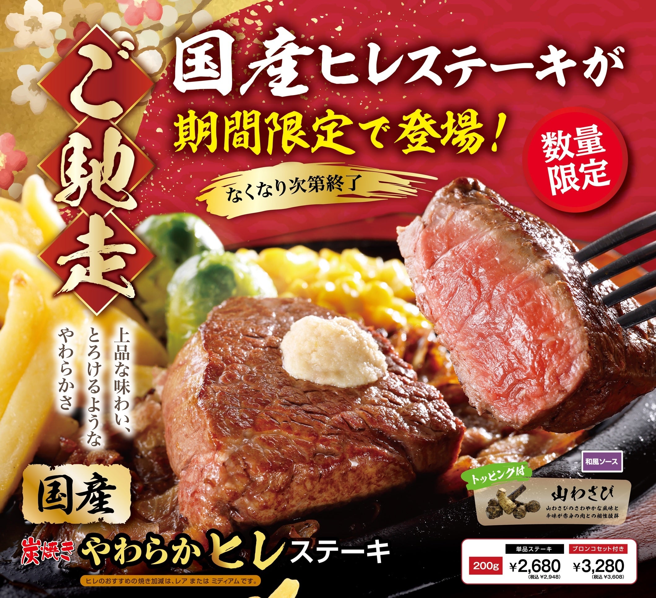 『国産 炭焼きやわらかヒレステーキ』が12月28日(火)より新発売!年末年始は久しぶりに会えたみんなと、ブロンコビリーでご褒美ディナーを