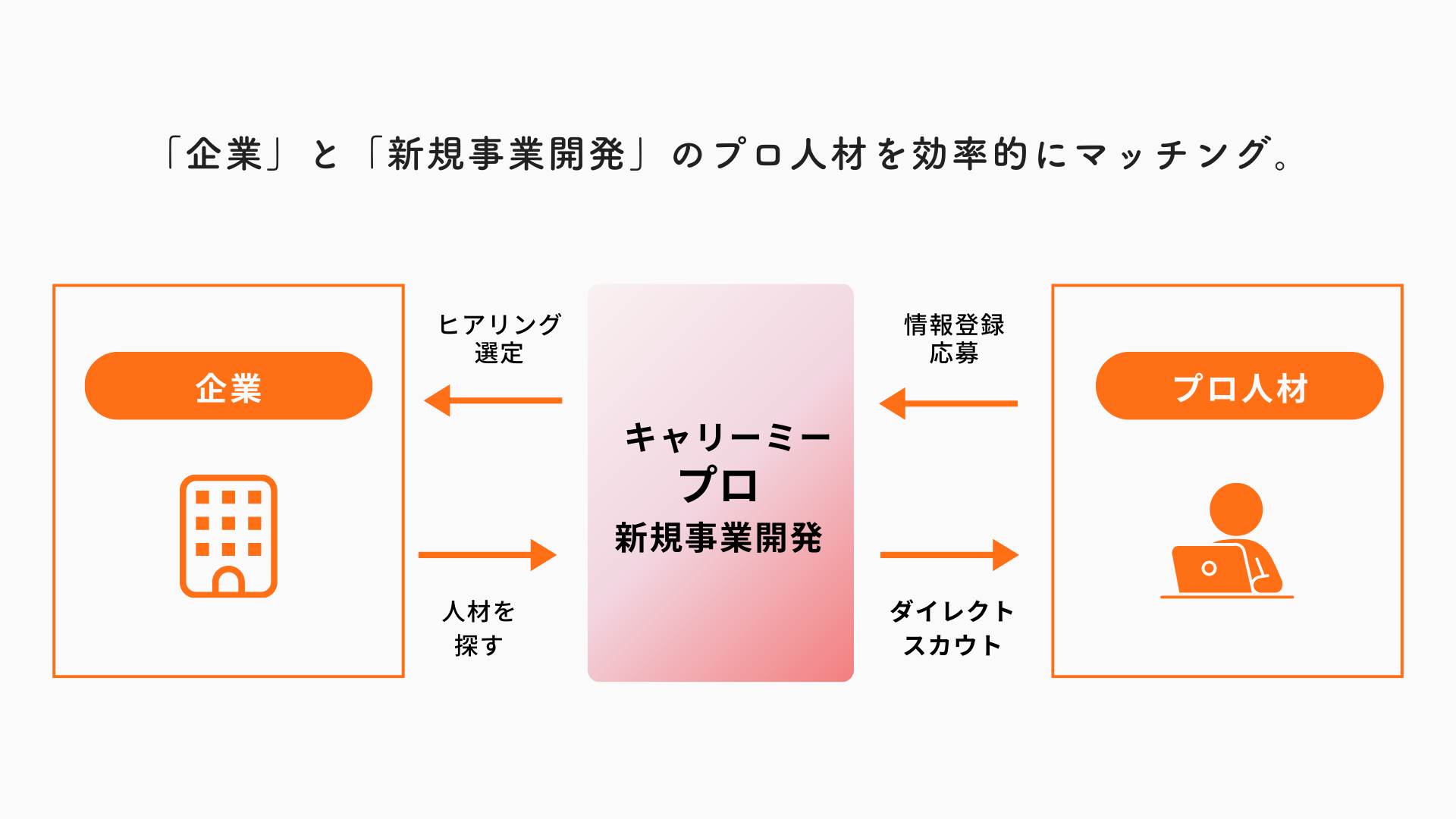 2016年に「プロ人材」と企業とのマッチングサービス「キャリーミー」をリリースしてから10年、新たに新規事業に特化したプロ人材のスムーズなアサインを実現します。
