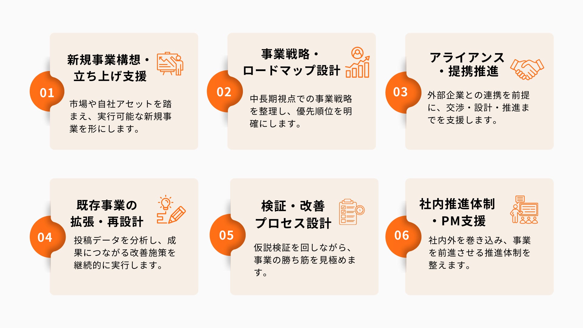 専門領域に特化した人材によるコンサルや壁打ちから、社内のスタッフと施策を進める伴走支援型のマネジメントまでご要望に沿った関わり方での支援が可能です。