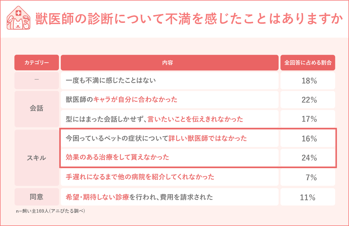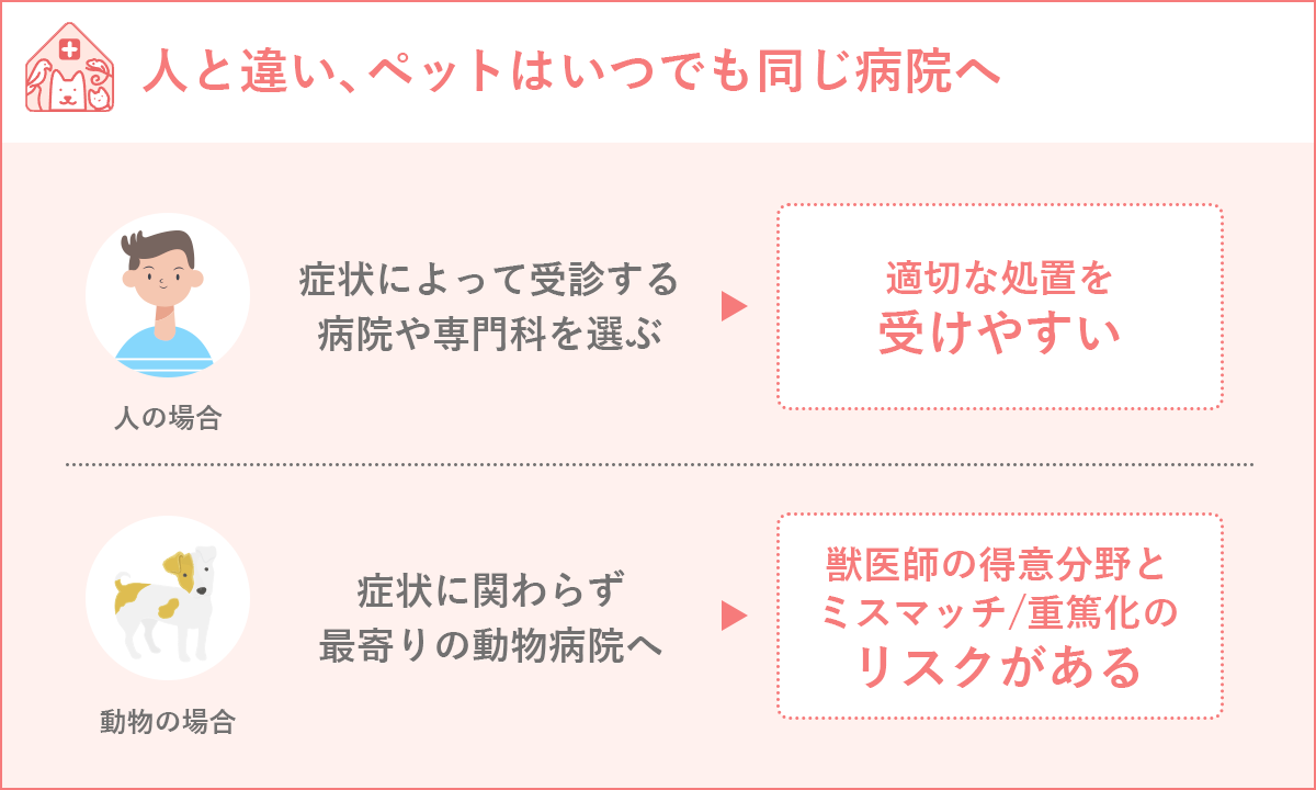 実際、飼い主にアンケートを取ったところ、獣医師のスキルや治療についての不満を応える方が多くいました。事前に「それぞれの獣医師が何を得意としているのか」を知る術がないため、ミスマッチが起こっているのです。結果として獣医師が得意ではない疾病に対して処置・手術をし、疾病が重篤化・死亡するケースが実際に数多く発生しています。