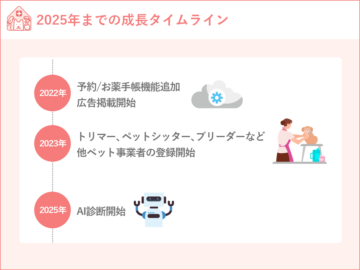 2025年を目処に、精度の高いAI診断や獣医師の選定ができるサービスに進化させ、オンライン相談で蓄積された文章・画像を解析を通じて精度の高いAI診療や獣医師の選定を提供。飼い主と獣医師を含むペット事業者とのコミュニケーションを、AIの力でさらに滑らかに。より早く、より正確に飼い主の悩みごとにマッチした回答や提案ができるサービスとして進化させる計画です。
