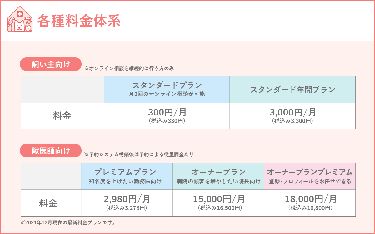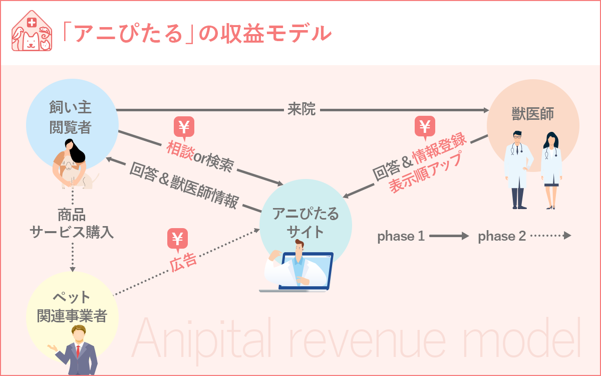 ビジネスモデルは、オンライン相談を継続的に行う飼い主から月額300円と、掲載する獣医師からの月額15,000円がメイン収入です。