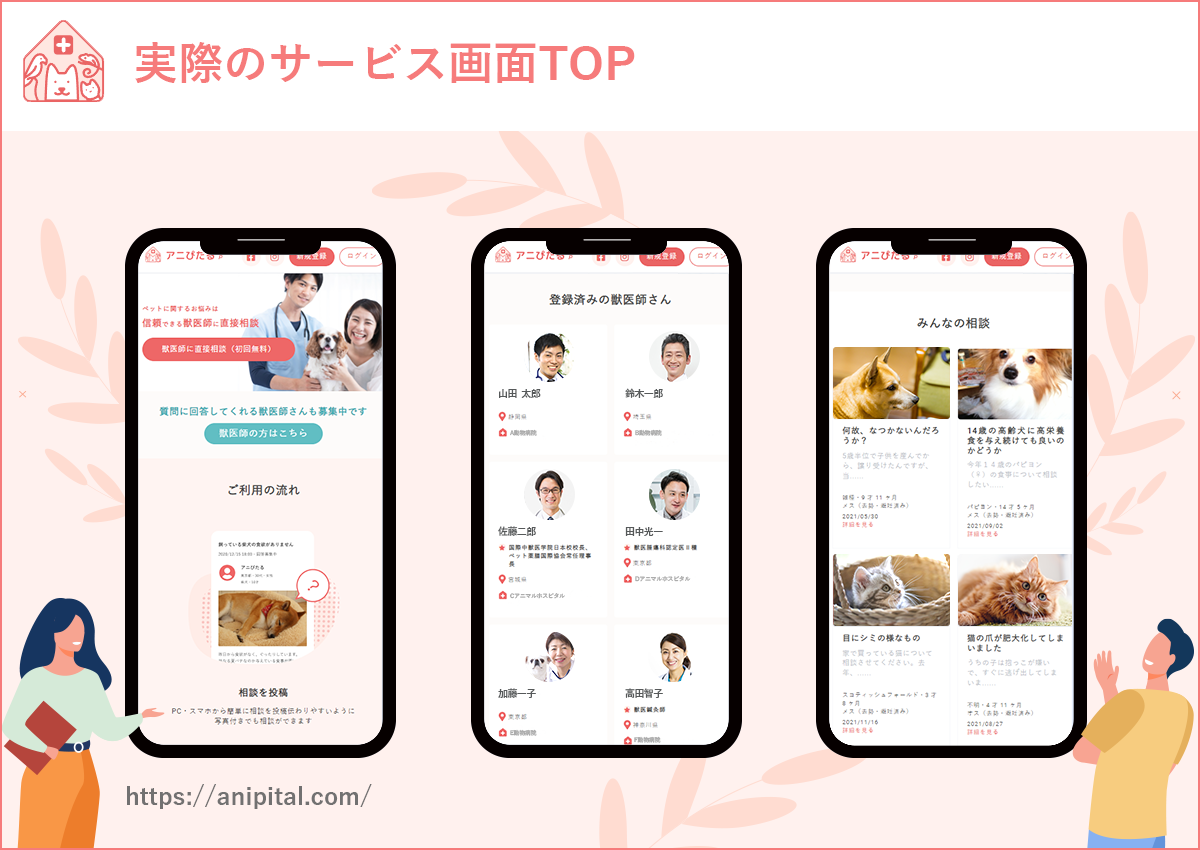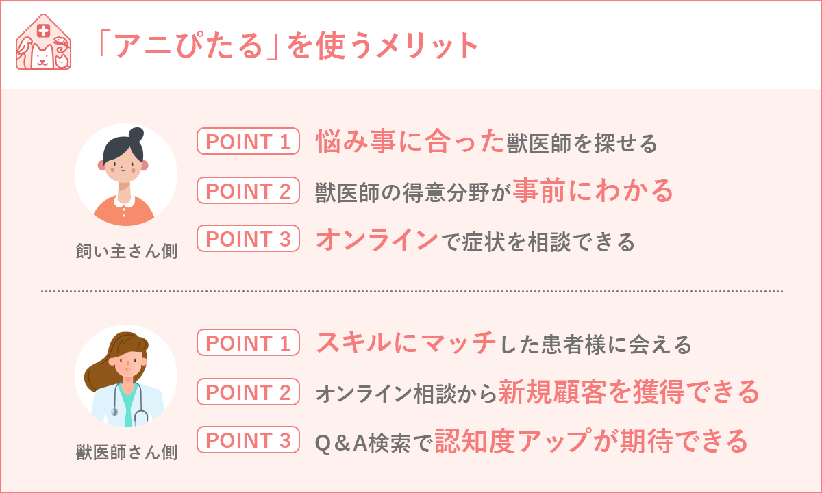 そこで「アニぴたる」は、獣医師検索&オンラインでペットのお悩みを相談できるサービスを提供し、飼い主と獣医師のwin-winな関係を築きます。