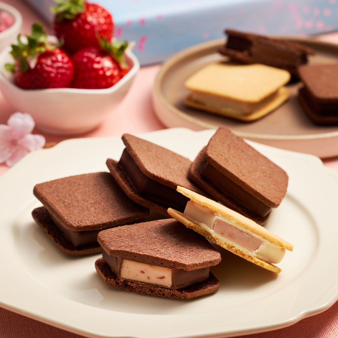 刻んだ桜の花の塩漬けに桜あんや桜のペースト、桜葉をホワイトチョコレートに混ぜ込んだ、生チョコクッキーサンド「ショーコラ・さくら」と、苺の果実を丸ごと使用した「ショーコラ・あまおう」に加え、定番のビターチョコレート、ミルクチョコレートが楽しめる春の爽やかな青空をイメージしたパッケージの期間限定アソートです。