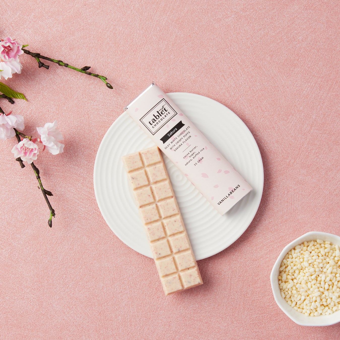 桜餅をイメージした春にぴったりのタブレットショコラ。こだわりのホワイトチョコレートに桜の花の塩漬けを合わせた甘じょっぱさと、ライスパフの食感を楽しめる限定フレーバーです。横浜みなとみらいにある"VANILLABEANS THE ROASTERY HAMMERHEAD"に併設する工房にて1枚1枚丁寧に作っています。