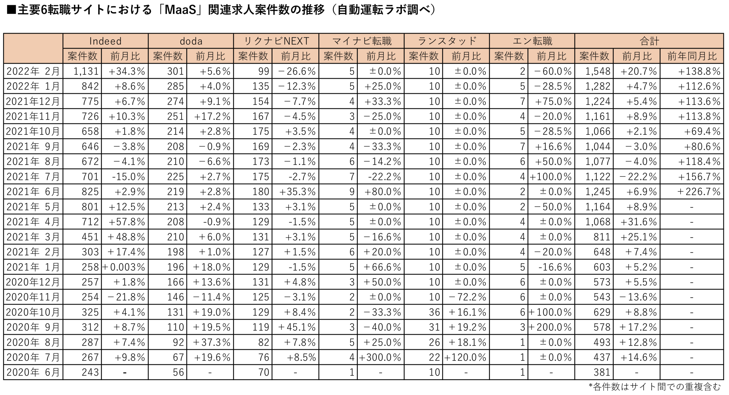 「MaaS」の関連求人案件数(主要転職6サイト)は2022年2月末時点で、前月比20.7%増、前年同月比138.8%増の1,548件となりました。前月比での増加は5カ月連続です。