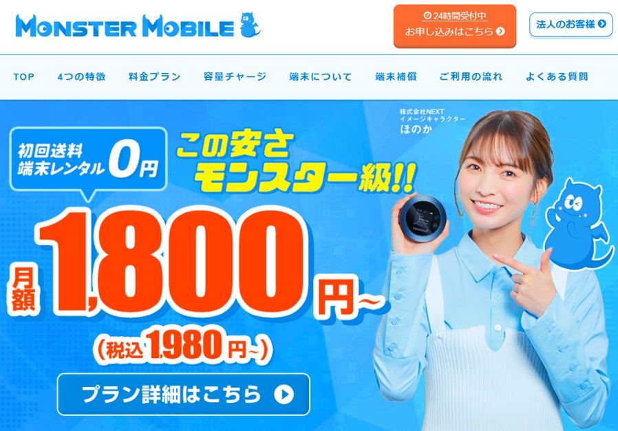 サービス内容のリニューアルに伴い、これまでよりもさらに安い月額料金でご提供させていただきますので、MONSTER MOBILEのお申し込みをご検討されている方はこの機会に是非ご利用ください。