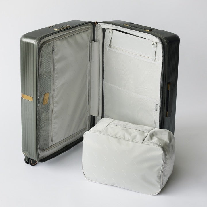 淡いグレーの生地でデザインされた内装には、定番モデルの「ミンター」と同様に、両面には荷崩れを防ぐディバイダーを装備。右側は取り外し可能で、付属のフックにより、旅先でそのまま掛けて使うことができます。また、衣類の整理などに便利な大きめのパッキングキューブも付属し、パッキングをサポートします。快適な操作性でスムーズな移動を実現するサスペンションホイールも搭載するなど、定番モデルの機能性はそのままに、限定モデルならではの特別な仕様となっています。