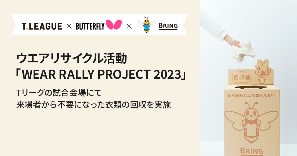 Tリーグ×バタフライによるウエアリサイクル活動「WEAR RALLY PROJECT 2023」、BRINGが協力をしてTリーグの試合会場にて来場者から不要になった衣類の回収を実施