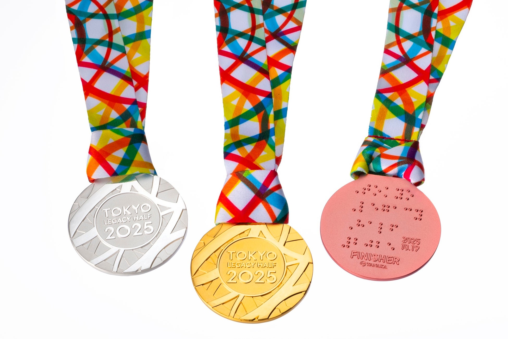 流れる曲線ですべてのランナーの走る軌跡を表現した「東京レガシーハーフマラソン2025」表彰メダルを提供