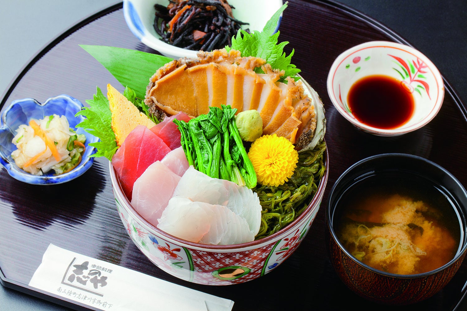 三陸沿岸で採れたえぞ鮑を、丸ごと1コ丼にのせて、春告げ野菜、魚介類、新物の海藻を添えて。